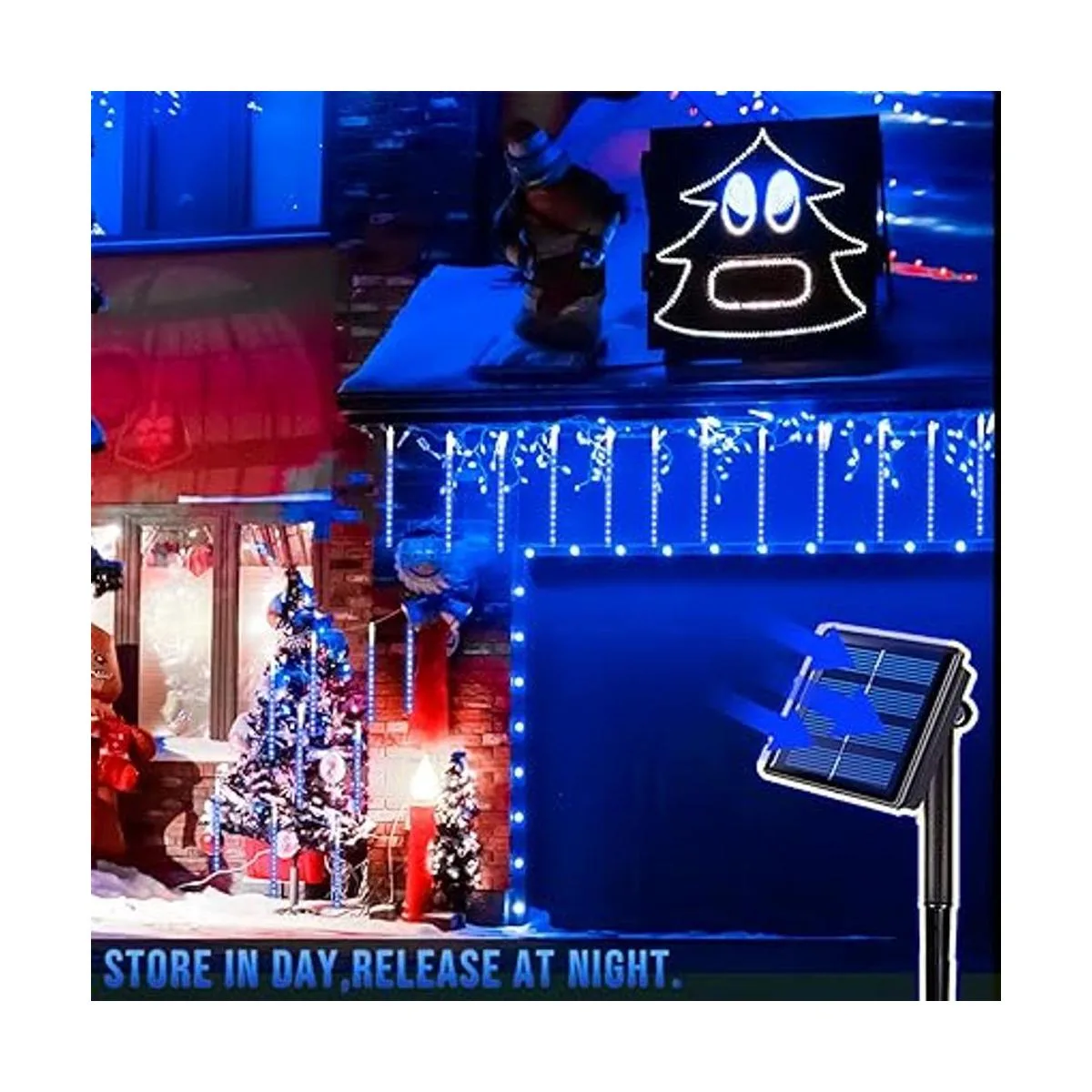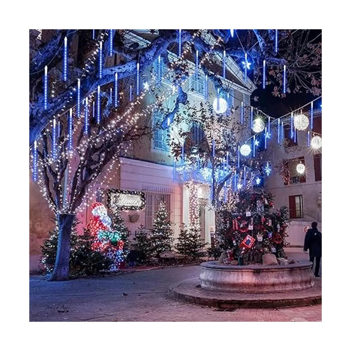 Hermosa y mágica decoración de luces solares de gotas de lluvia Las luces de lluvia Meteor son buenas para cualquier ocasión. Luces de ducha Meteor decoradas en azul en un pequeño árbol, parecen pequeñas bombas que caen del cielo, muy ricas en color y el movimiento es absolutamente llamativo. Son perfectos para decorar árboles a lo largo de la calle/parque/río, colgar a lo largo del techo, ideal para iluminación de ingeniería de mercado, embellecimiento urbano y arquitectónico. Ideal para terraza, patio, jardín, sala de hotel, centro comercial.