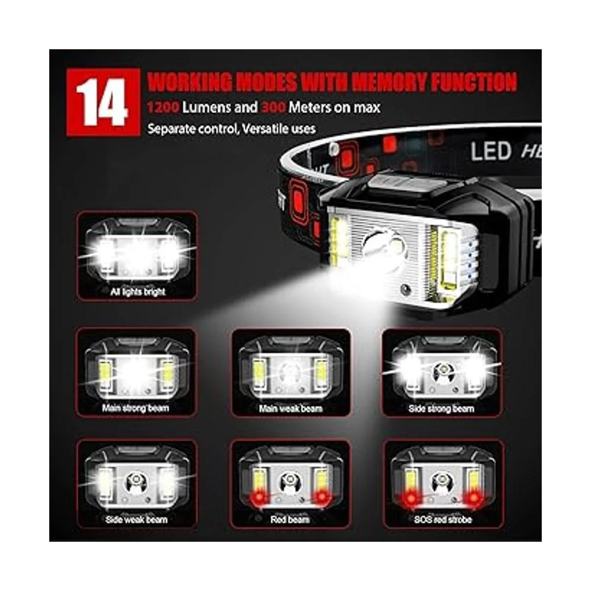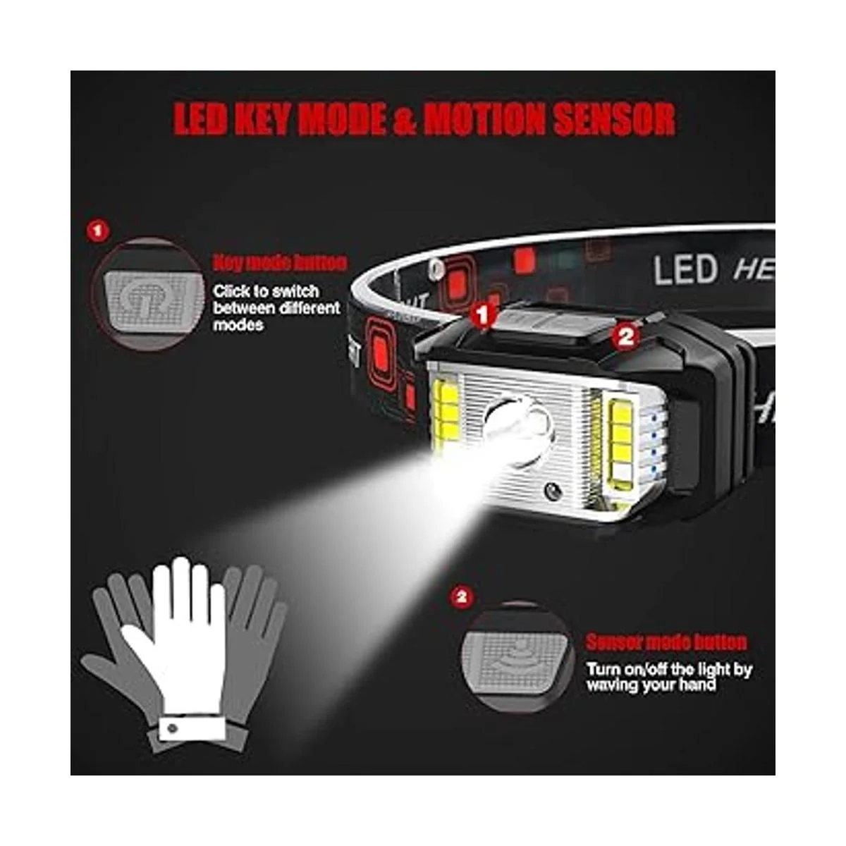 Impermeable y 14 modos: la lámpara frontal de riel industrial tiene una tasa de impermeabilidad IPX4 para una máxima fiabilidad. La carcasa de alta calidad está más sellada para soportar la lluvia o la nieve desde todos los ángulos, adecuada para interiores o exteriores. El faro LED tiene 14 modos para satisfacer todas tus necesidades. 7 modos de tecla LED, puedes cambiar el haz fuerte principal, haz débil principal, haz fuerte lateral, haz débil lateral, todas las luces brillantes, haz rojo, estroboscópico rojo. 7 modos de sensor de movimiento, puedes encender y apagar fácilmente las luces agitando tu mano.
