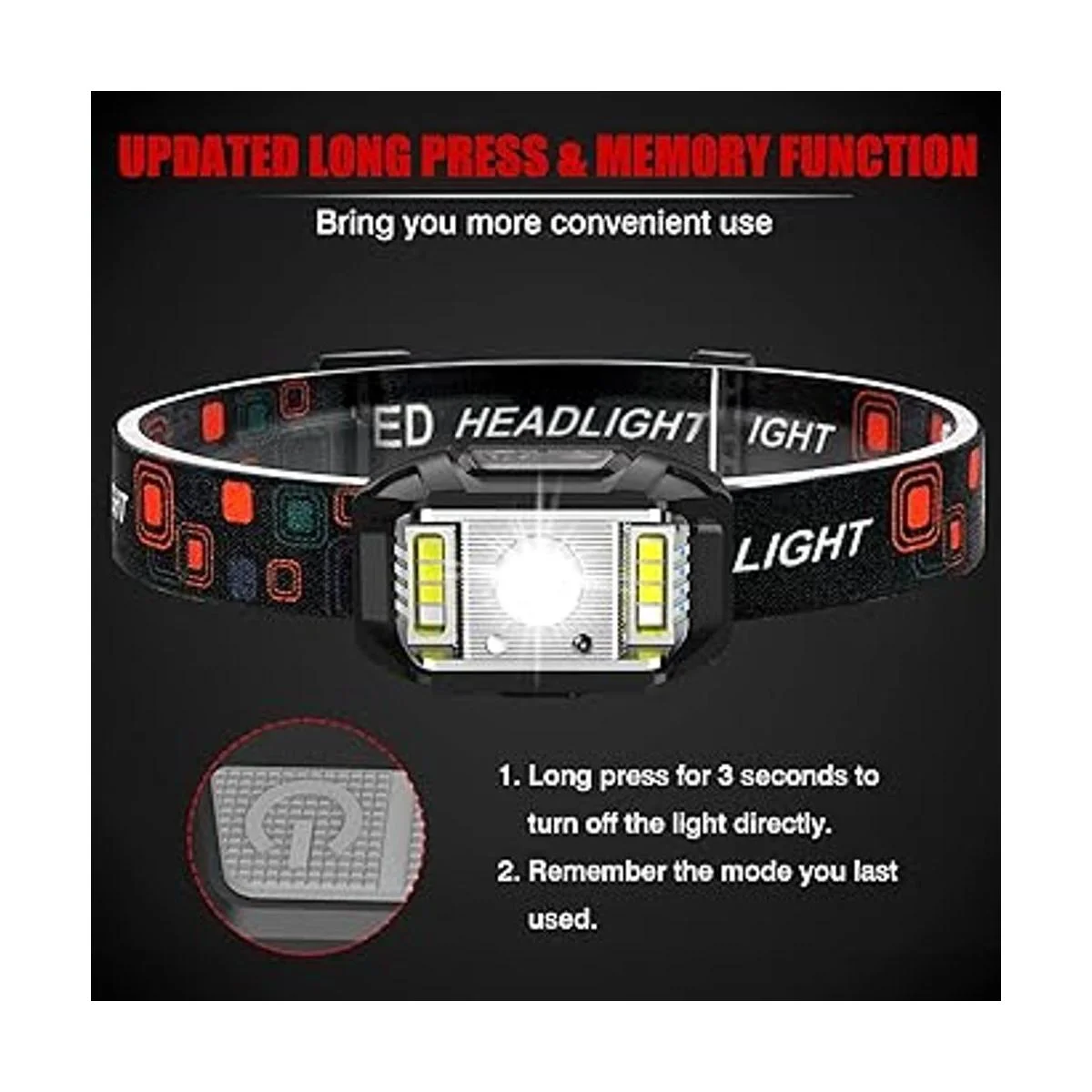 Función de pulsación larga y memoria: a diferencia de los demás, las linternas de faros JNDFOFC añaden función de pulsación larga y memoria. En cualquier modo, mantén pulsado el botón de modo de tecla durante 3 segundos, las luces se apagarán directamente, sin ciclismo a través de todos los modos. Con la función de memoria, cuando se enciende de nuevo, la luz permanecerá en el modo que utilizaste la última vez, lo que hace que tu uso sea más cómodo y fácil.