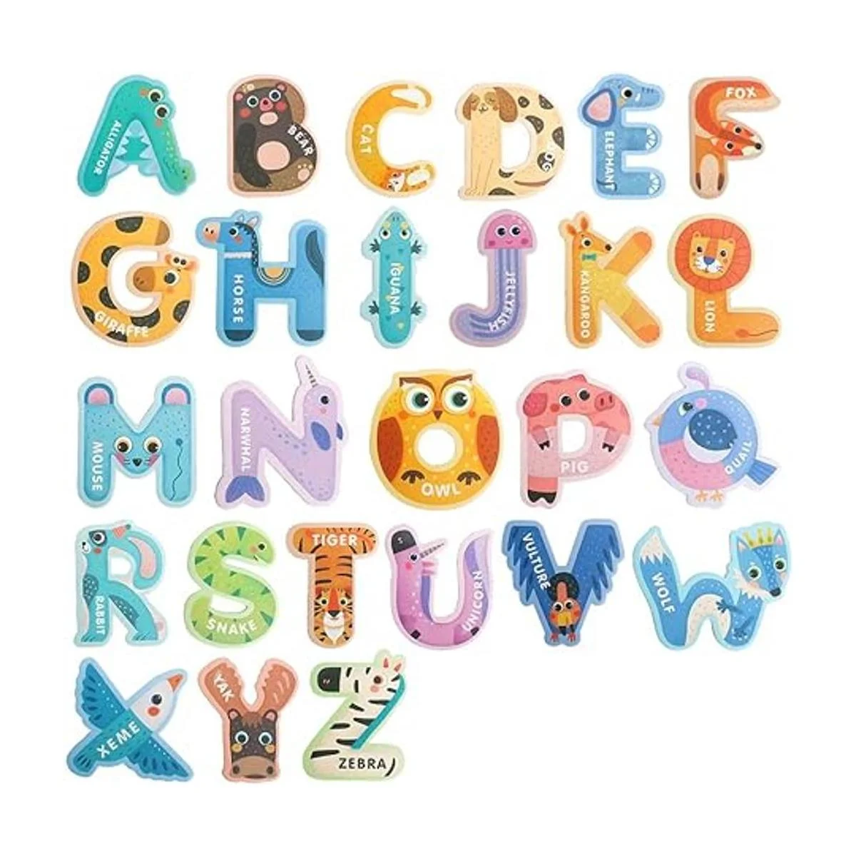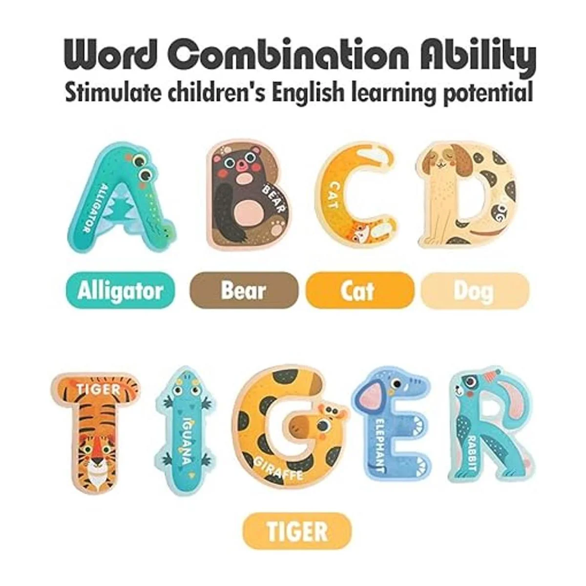 Diseño bonito e interesante Este producto contiene 26 letras, y cada letra se muestra en la imagen de un animal, lo que permite a los niños aprender la ortografía de los animales mientras aprenden las letras.