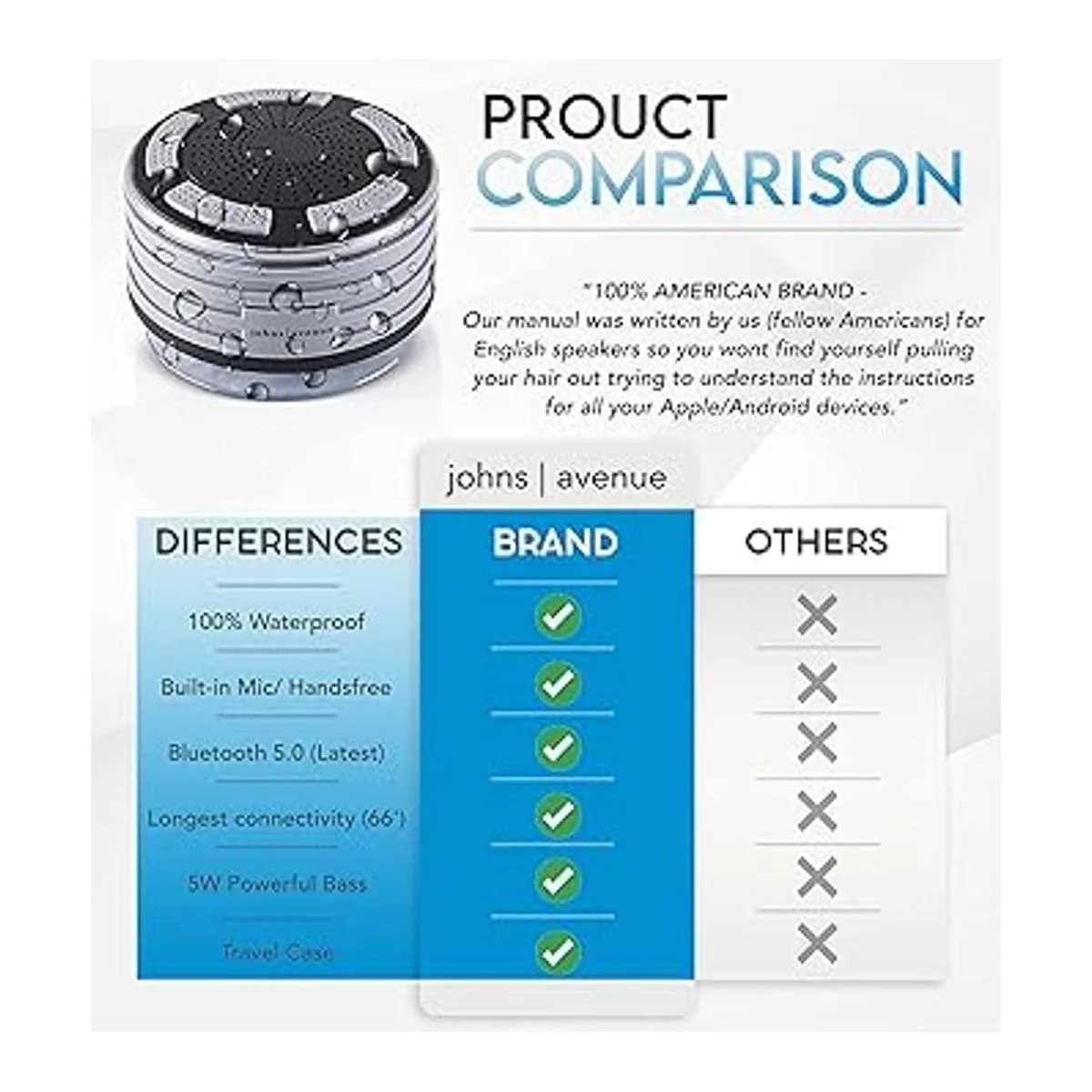 Johns Avenue Altavoz de ducha Bluetooth con funda de viaje con cremallera Versión más reciente 5.0 Certificado impermeable Empareja de forma inalámbrica fácilmente a todos tus dispositivos Bluetooth