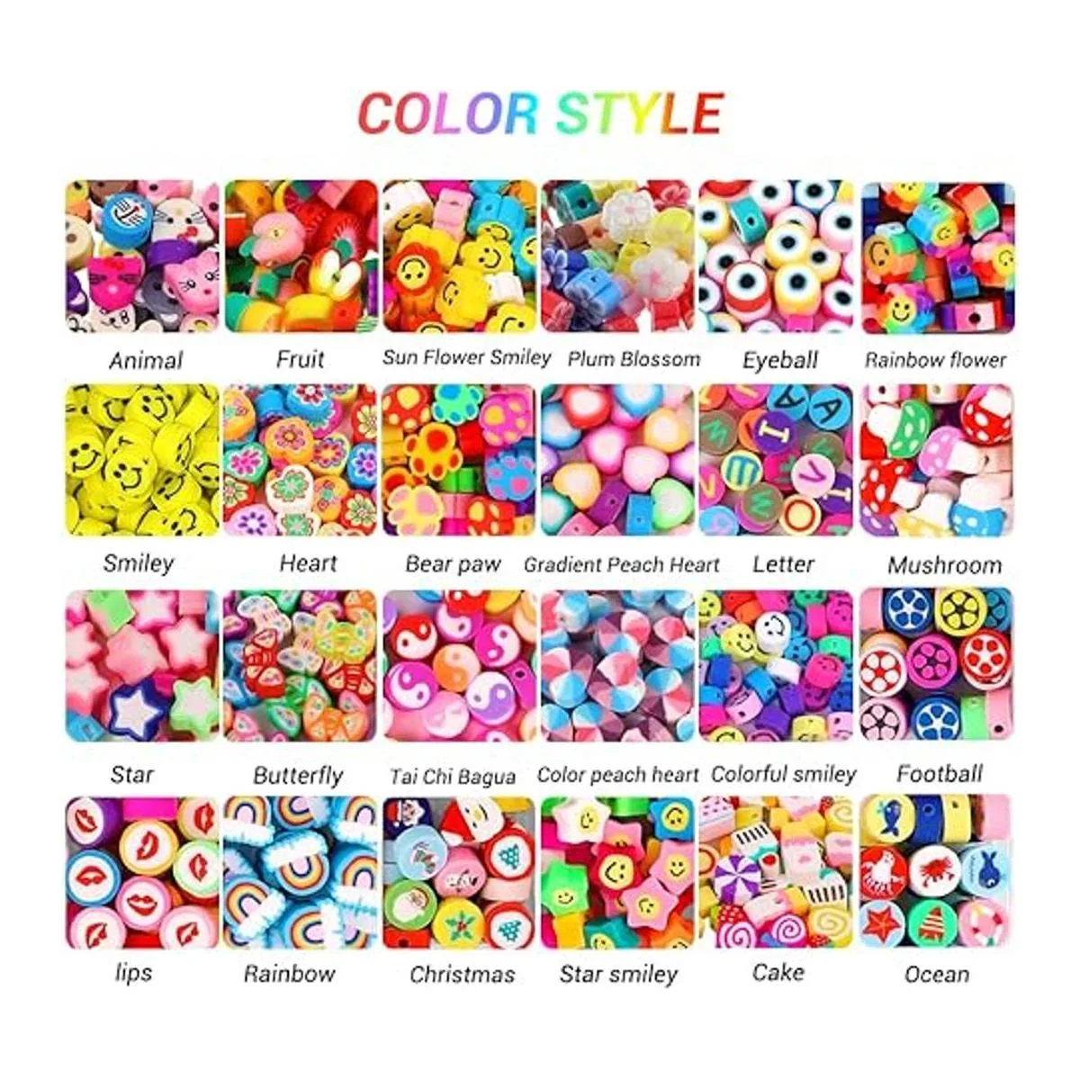 Rich Styles And Vibrant Colors:24 different shapes beads contain, fruit, animals, flowers, heart, stars, smiley, candy, letters, rainbow, rainbow, mushroom, soccer, ocean, yinyang, Christmas, rich themed beading and vibrant colors enough to satisfy your childs love.