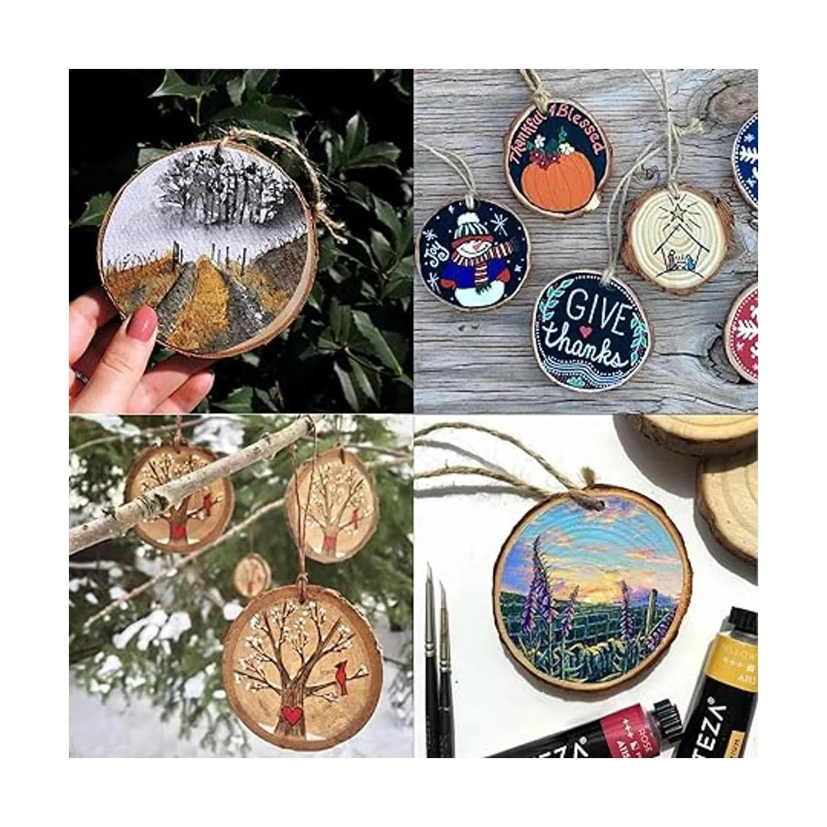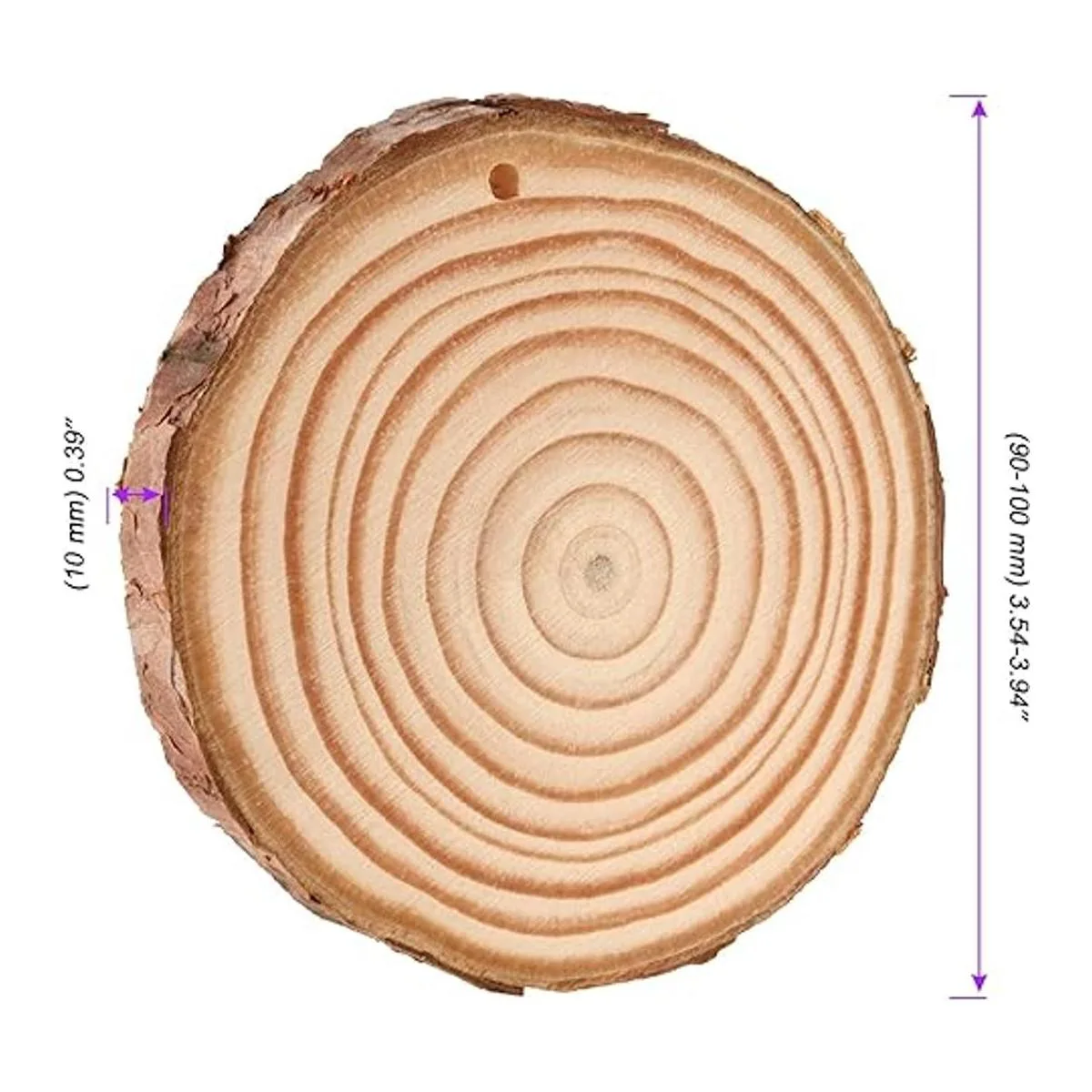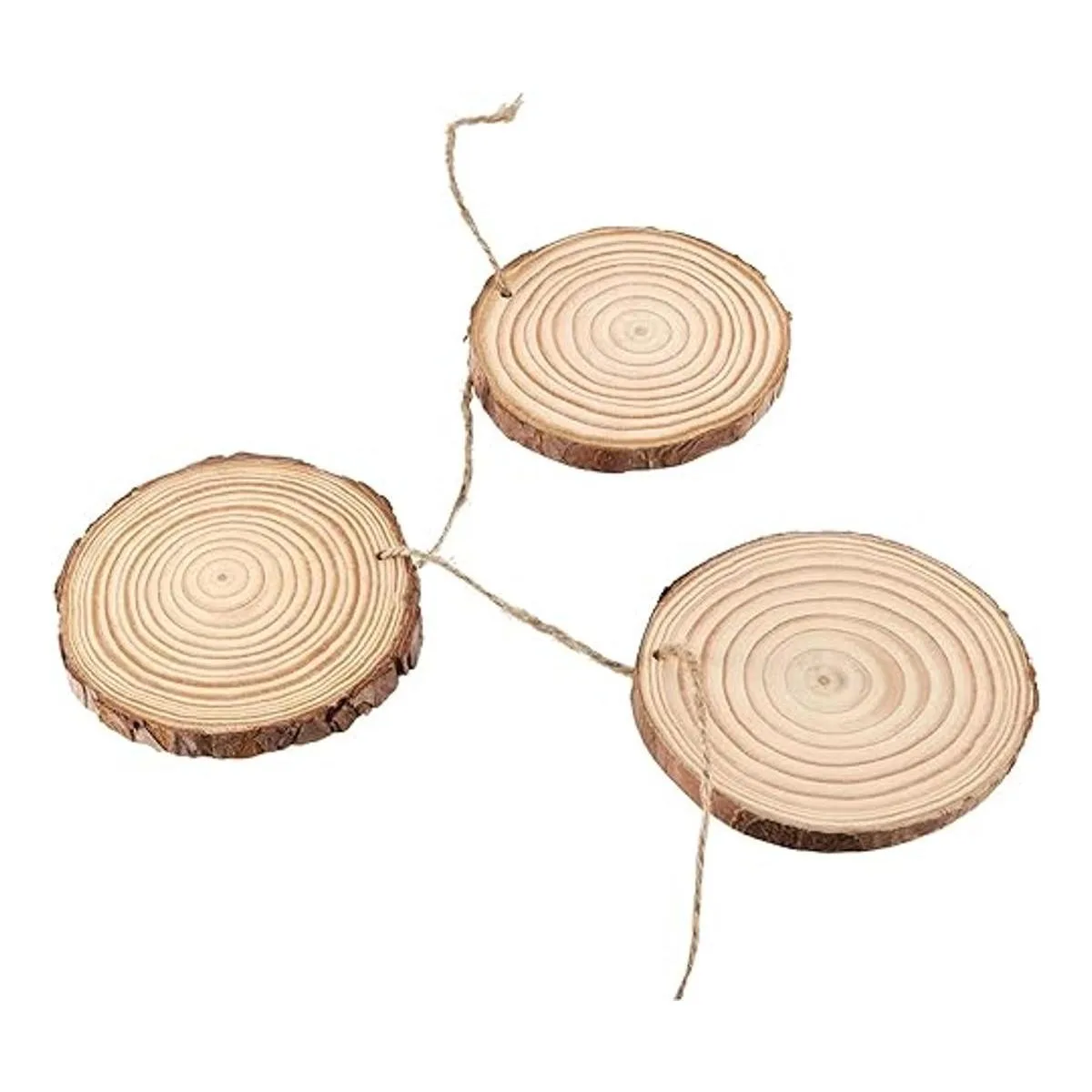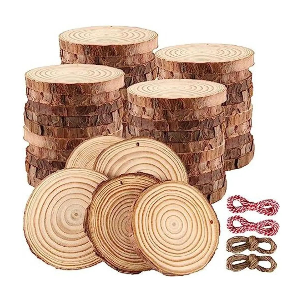 JOIKIT 50 piezas de rebanadas de madera natural de 3.5 a 4 pulgadas, círculos de madera natural sin terminar con agujero preperforado, incluyen cuerdas para artes, adornos de Navidad, manualidades de bricolaje, decoraciones de boda rústica
