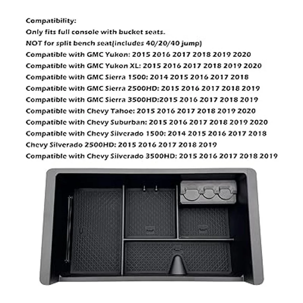 Compatibilidad: la bandeja de inserción de la consola central se adapta a GMC Yukon: GMC Yukon XL modelo 20202015 GMC Sierra 1500 modelo 20152020 GMC Sierra 2500HD modelo 20142018 20152019 GMC Sierra 3500HD:20152019 Chevy/ Tahoe: Chevy Suburban 20152020: Chevy Silverado 1500 20152020: Chevy Silverado 2500HD 20142018: Chevy Silverado 3500HD 20152019: 20152019