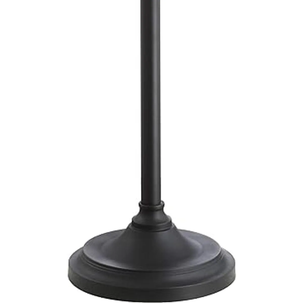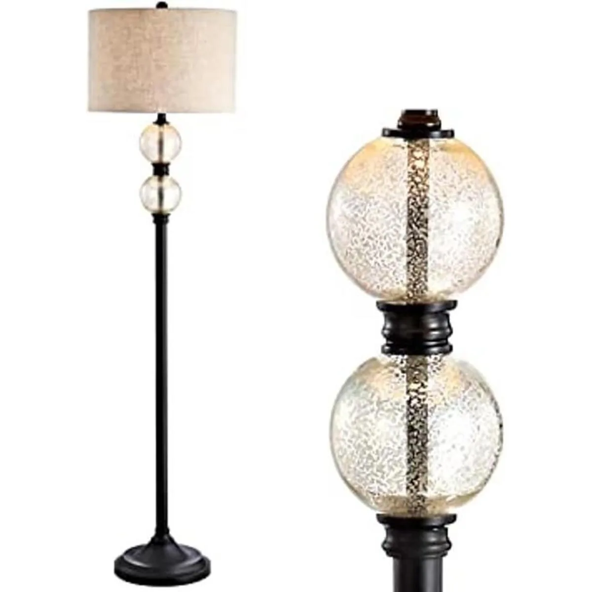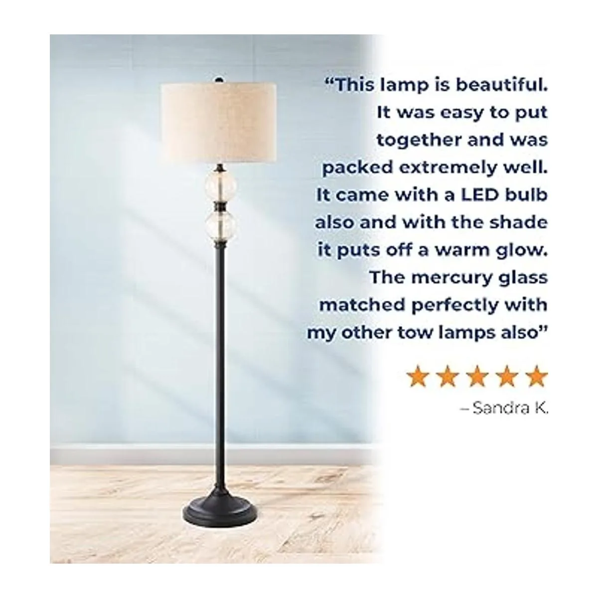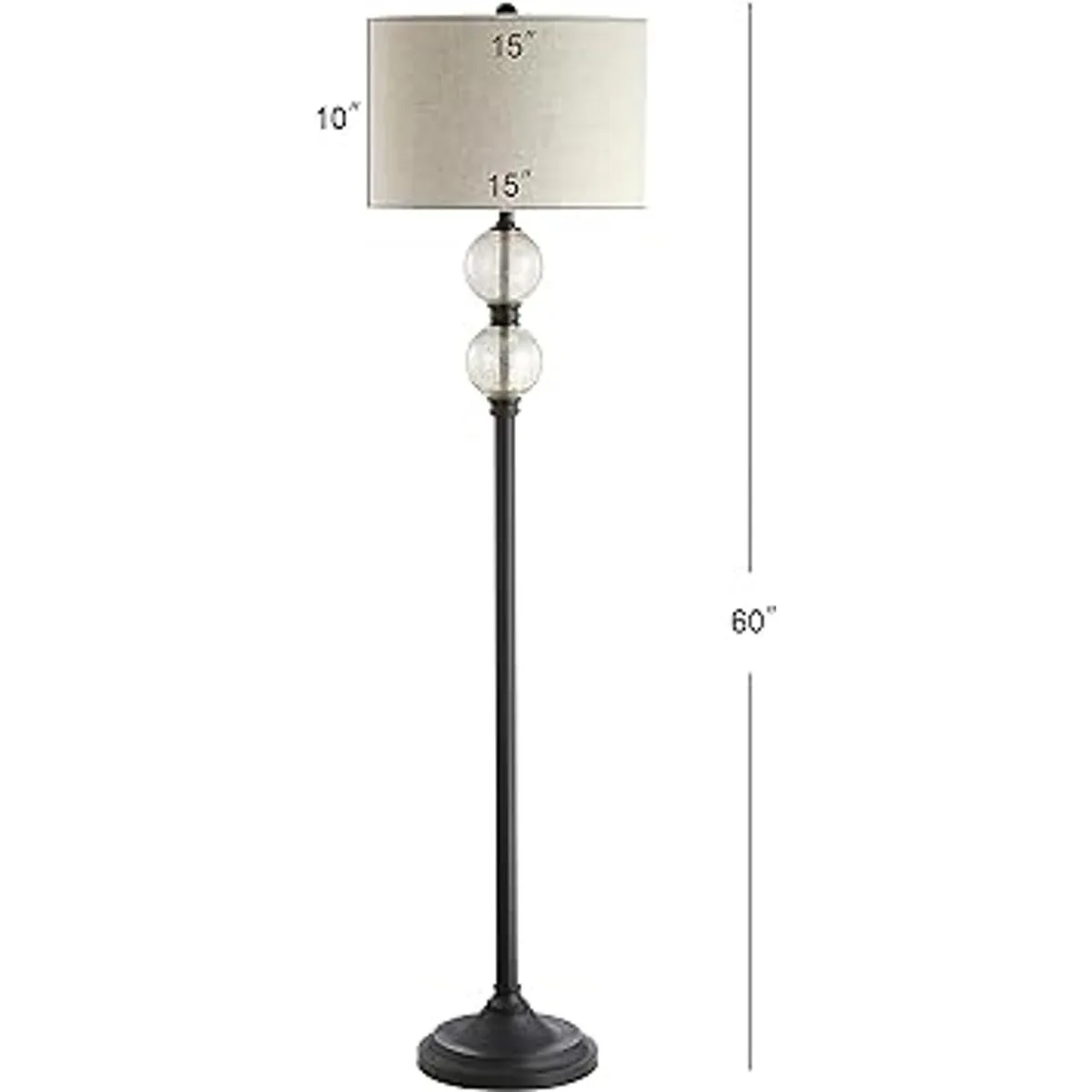 Una lámpara de pie clásica de 60 pulgadas de alto con una pantalla de tambor recibe un mayor interés con la adición de dos orbes de vidrio que parecen brillar mientras la luz se proyecta sobre ellos cuando se ilumina. La altura perfecta para crear un rincón de lectura junto a un sofá o silla, la pantalla de tambor de 15 pulgadas permite una amplia luz sin deslumbrar. Acabado en bonze frotado con aceite y con un cable de envoltura de seda, simplemente presiona el interruptor de encendido/apagado para iluminar la luz.