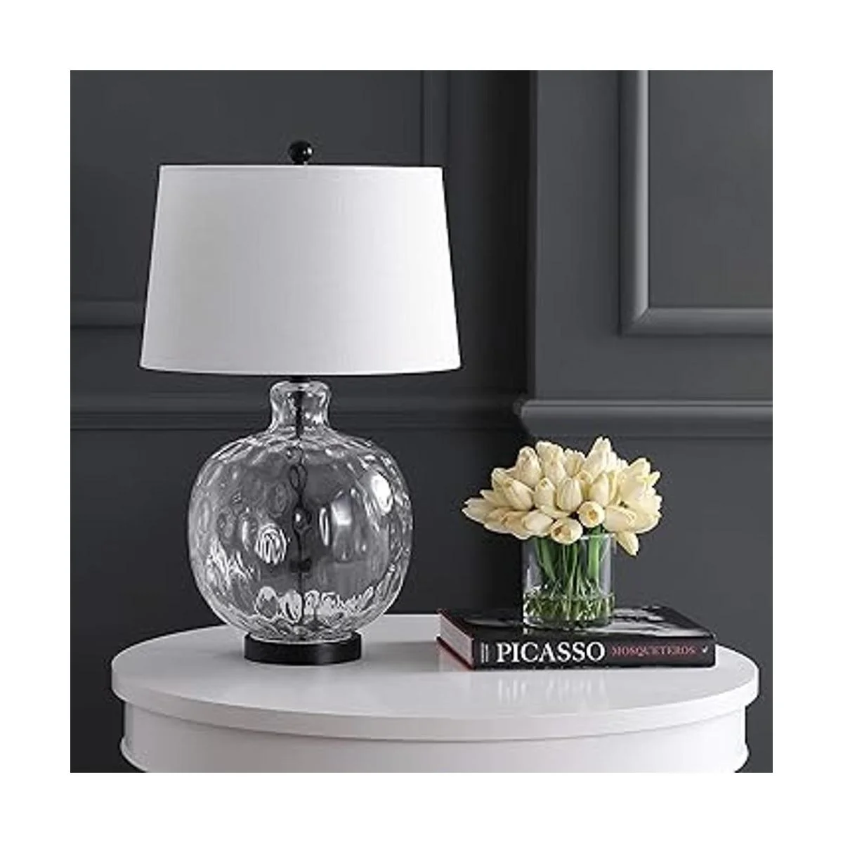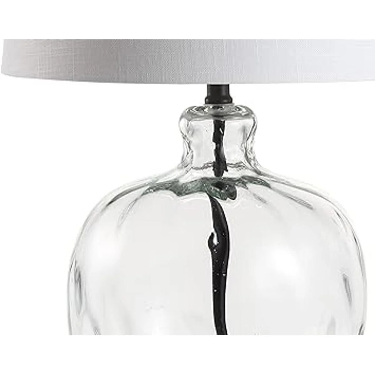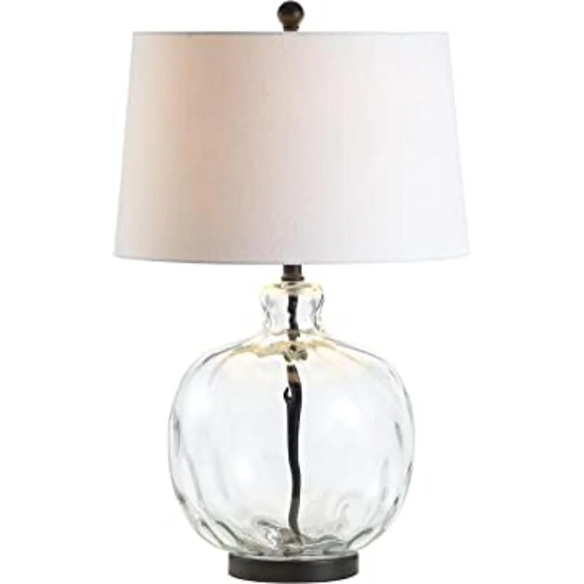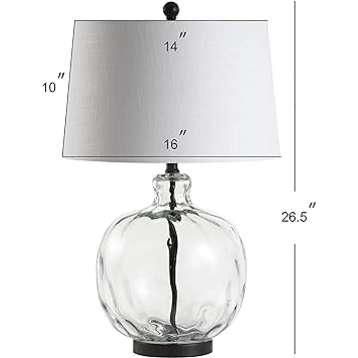 Esta lámpara de mesa de cristal con textura y forma combinada con una pantalla de lino blanco es un complemento clásico para el hogar. Con un cordón envuelto en seda y acabado en negro, se puede combinar fácilmente con cualquier paleta de colores. A 26.5 de alto, esta es una hermosa pieza que puede exhibirse en cualquier espacio. Nos encanta como se ve sobre una mesa lateral.