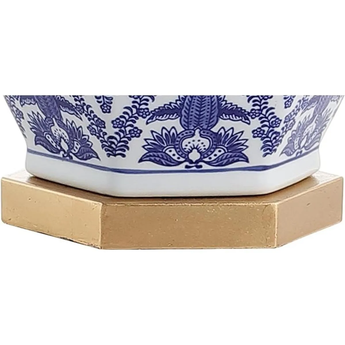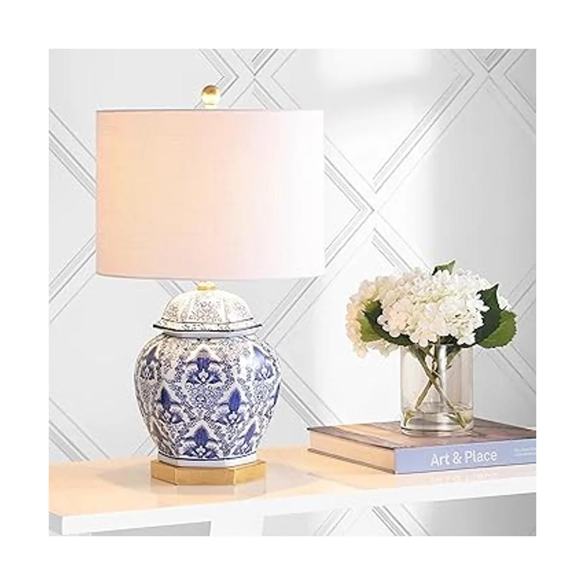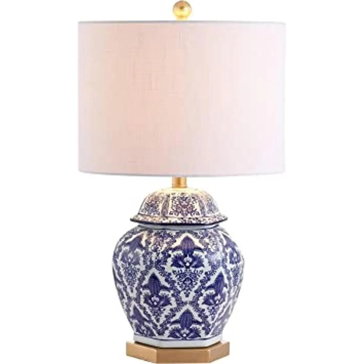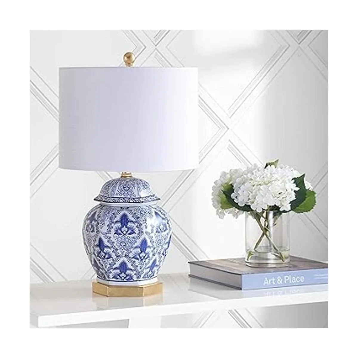 Una forma clásica de tarro de jengibre de inspiración china se ve actual y fresca en una base de damasco azul y blanco y latón