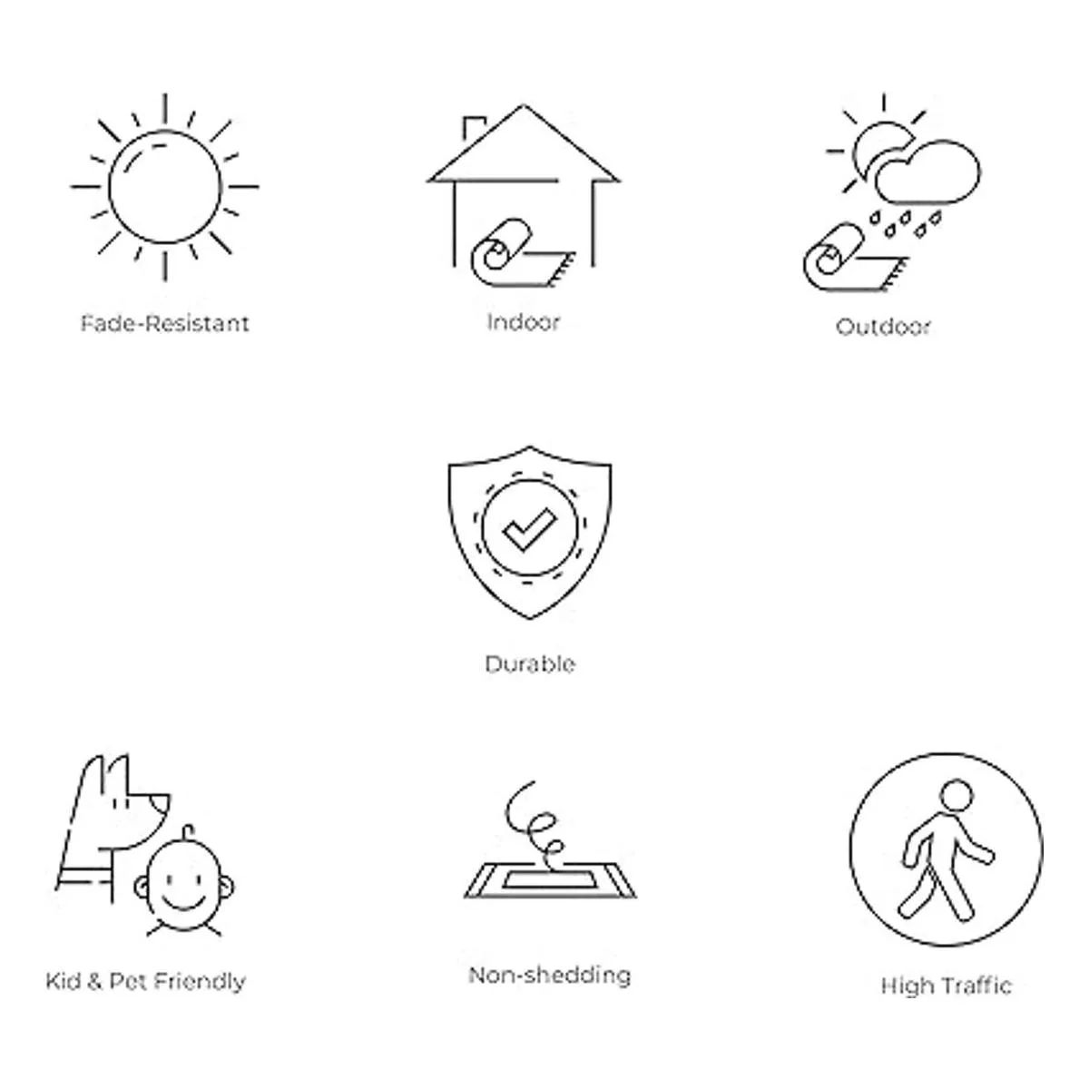 Fácil de cuidar: Aspirar y barrer regularmente para evitar que los materiales duros puedan deteriorar las fibras; para lavar una alfombra de exteriores, rocía la superficie con una mezcla de 5 a 1 de jabón suave y agua, después enjuaga la alfombra con una manguera de jardín y cuélgala de una baranda hasta que se seque totalmente.