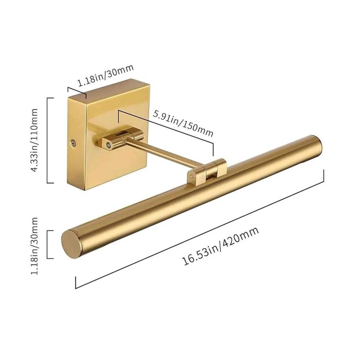 Brillo regulable: rango de atenuación del 5 al 100, las luces de pintura descrita son compatibles con la mayoría de los reguladores LED triac domésticos para un funcionamiento suave y sin parpadeo. Medidas: 16.5 pulgadas de largo, distancia de la pared: 7.8 pulgadas. Fuente de luz regulable y no reemplazable. Sin enchufe en el accesorio en sí mismo y no funciona con pilas, simplemente conecta al cable reservado directamente.