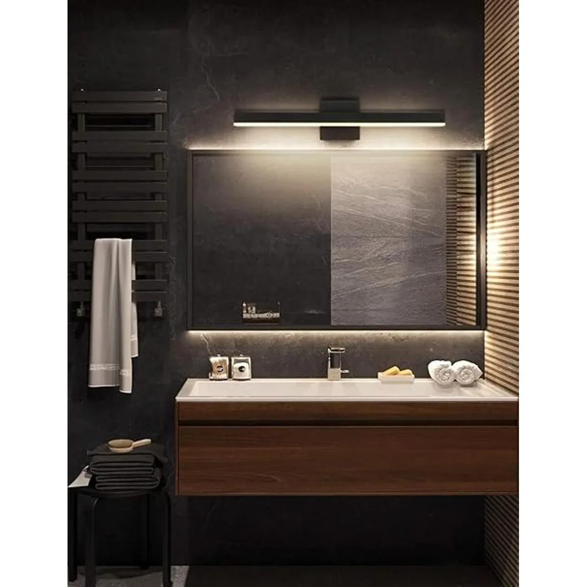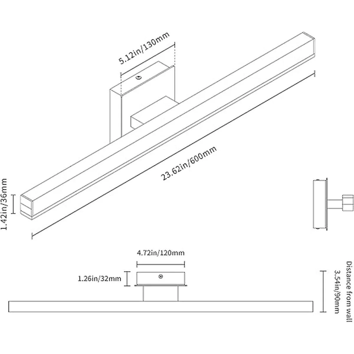 Especificaciones: 23.6 x 3.5 x 5.1 pulgadas largo x ancho x alto, toldo de pared de 4.7 x 4.7 pulgadas HxL, distancia de la pared 3.5 pulgadas, luces LED de baño de 16 W, temperatura de color de la lámpara: luz blanca cálida de 3000 K.