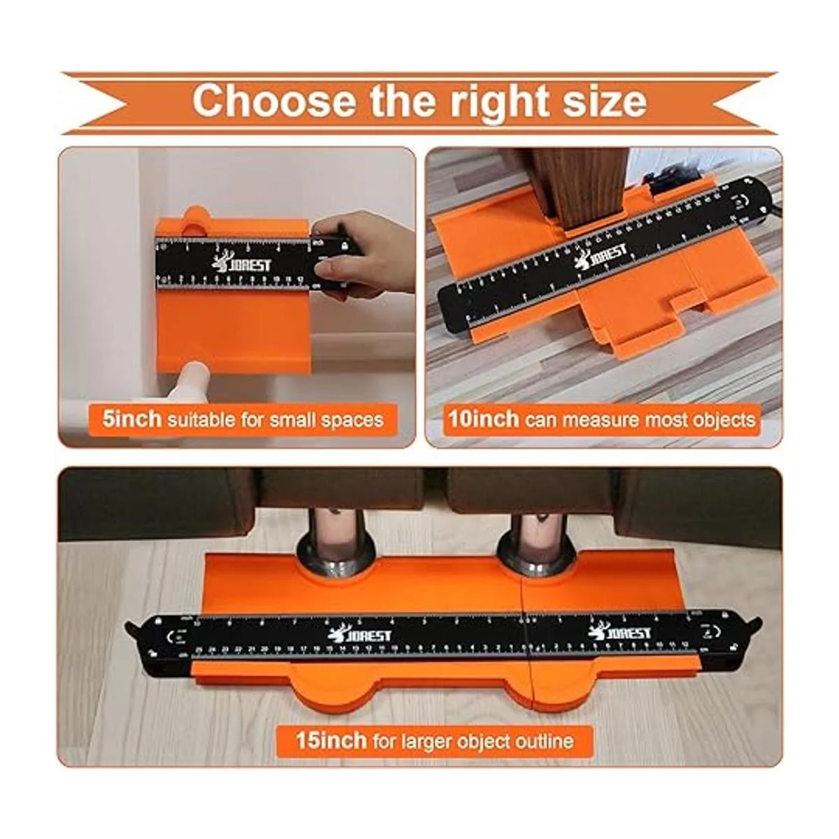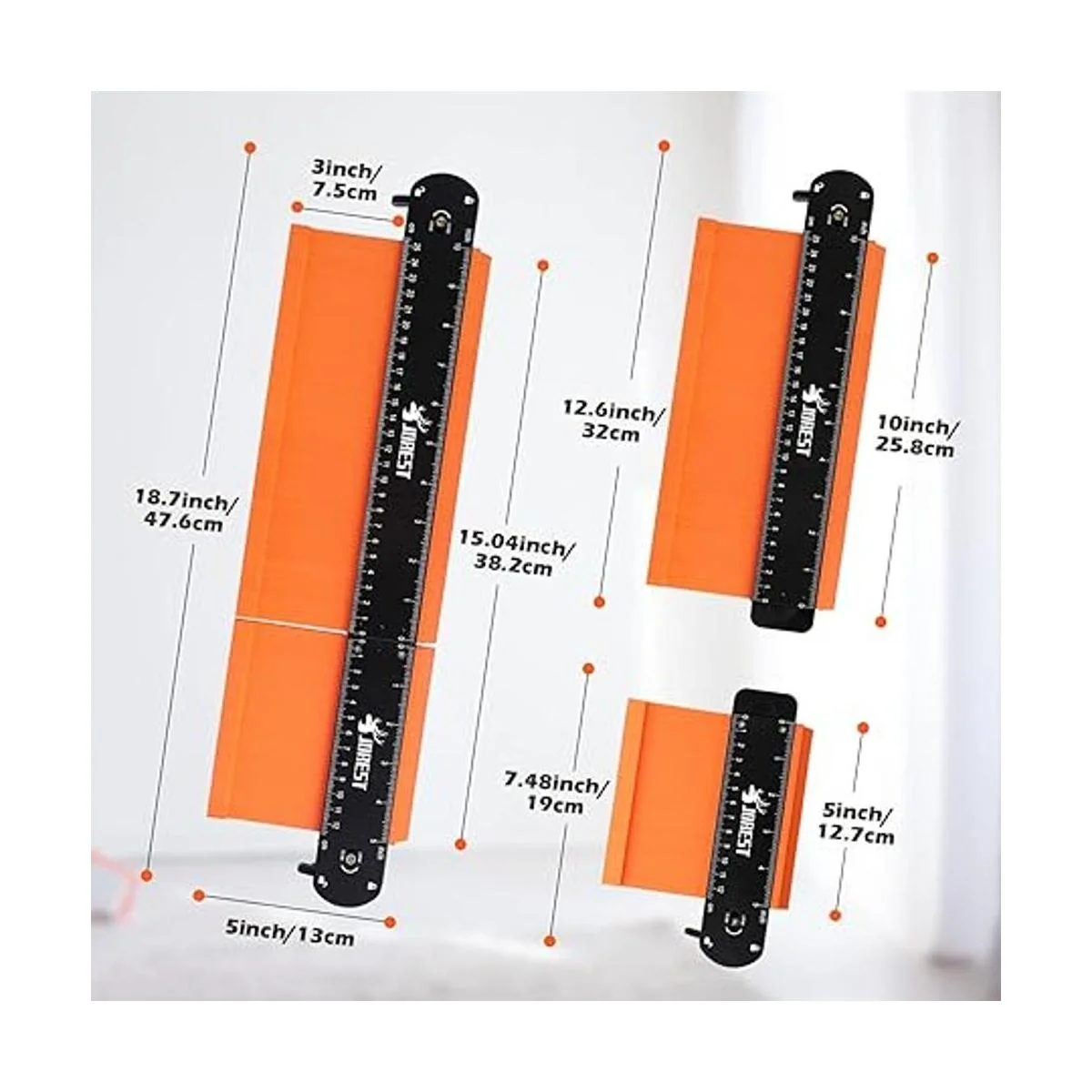Escenarios para calibre de perfil de 3 tamaños: 5 pulgadas es muy adecuado para algunos espacios estrechos; 10 pulgadas puede medir la mayoría de los contornos de objetos; 15 pulgadas puede copiar contornos de objetos más grandes, y 5 pulgadas y 10 pulgadas también se pueden utilizar juntos.