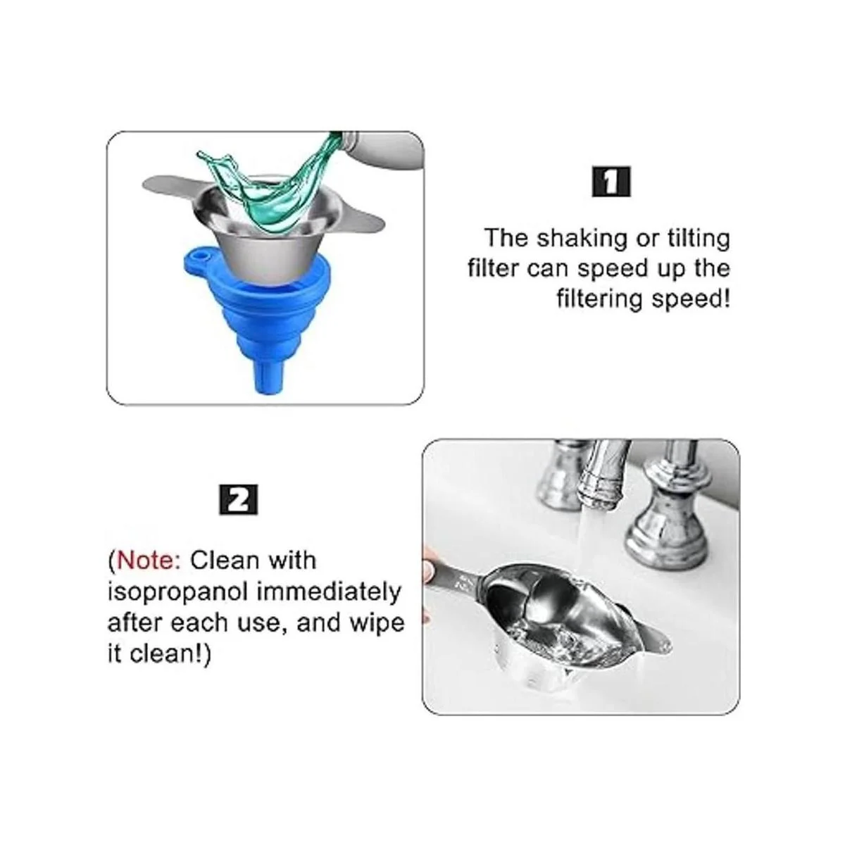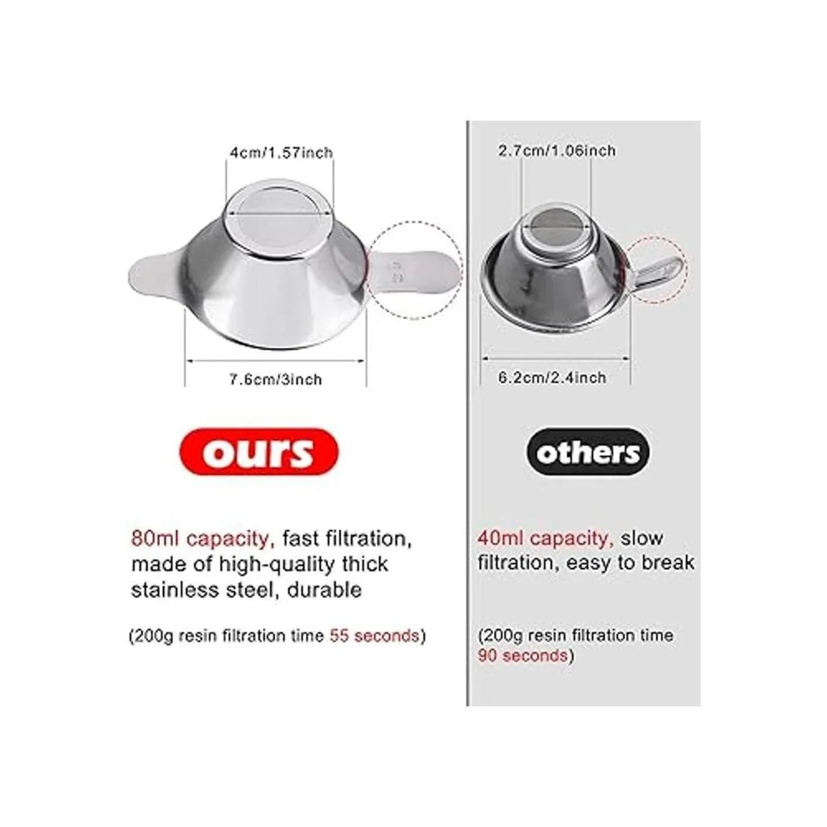 Dos tipos de filtros: el filtro de malla tiene una velocidad de filtración más rápida y ahorra tiempo el tiempo de filtración de resina de 7.05 oz es de 55 segundos, y otros filtros en el mercado son de 90 segundos; el filtro poroso es fácil de limpiar y duradero. El filtro y el mango bidireccional están hechos de acero inoxidable grueso de alta calidad, que es firme, no se deforma fácilmente y más cómodo de operar.