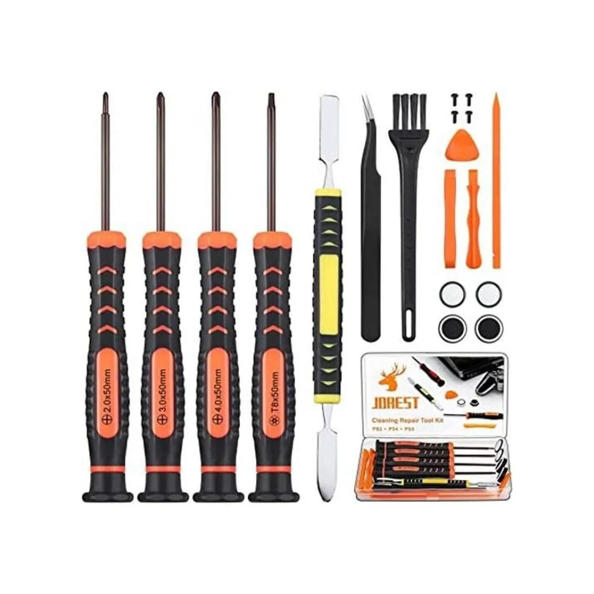 JOREST Kit de herramientas de reparación de limpieza para PS3 PS4 PS5, con destornillador de seguridad PH00 PH0 PH1 y T8 Torx, barras de palanca, pinzas, cepillo, tapas de agarre, tornillos, accesorios para controlador PS345 y consola