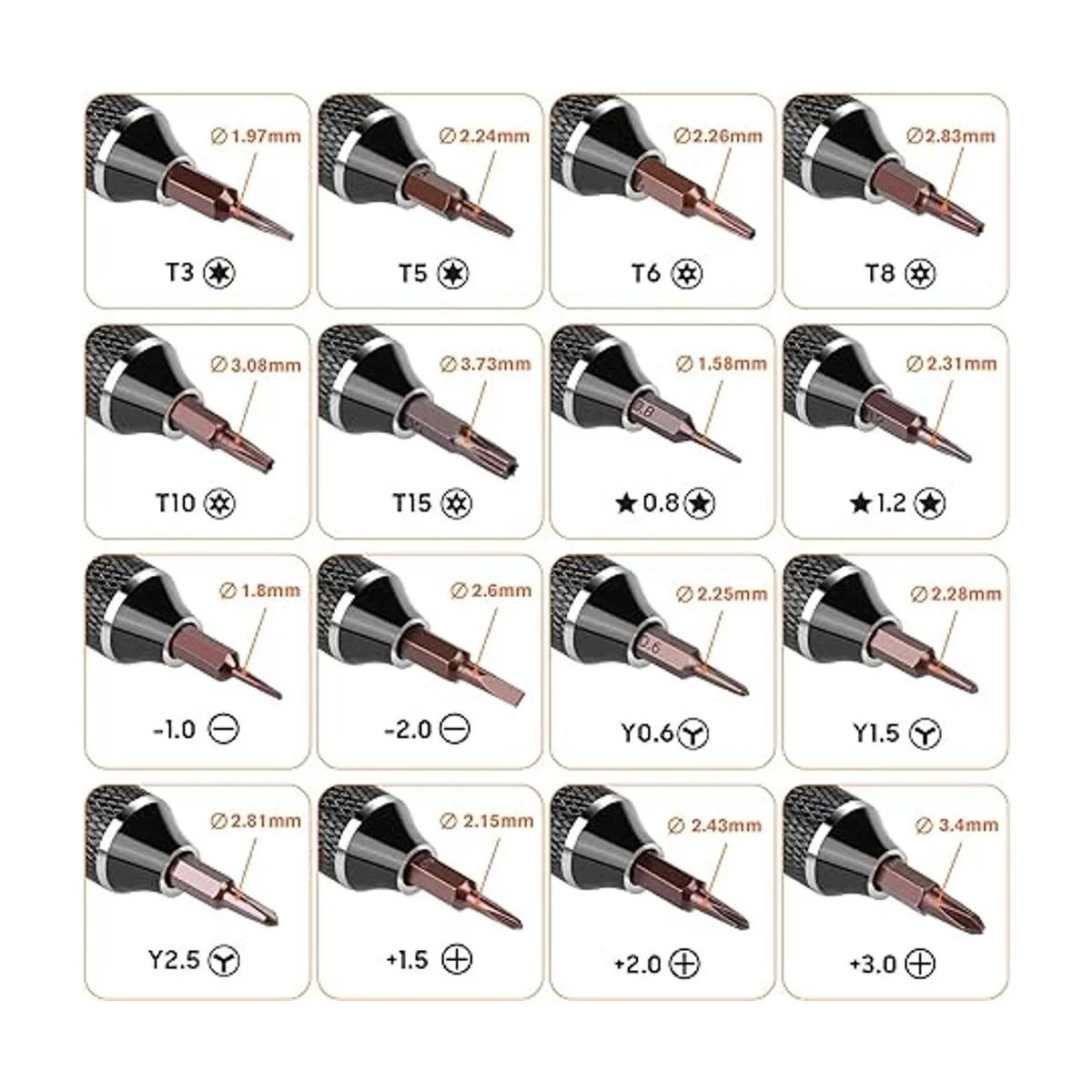 Juego de destornilladores de precisión: el juego de 24 destornilladores de precisión incluye 16 puntas de destornillador que son Philips 1.5 PH000 2.0 PH0 3.0 PH0, cabeza plana 1.0 2.0, Torx T3 T5, Torx Security TR6 TR8 TR10 TR15, Triwing Y0.6. Y000 Y1.5 Y00 Y2.5 Y0, pentalobe 0.8 P2 1.2 P5, con un mango de destornillador, un spudger de doble extremo, un spudger largo, un spudger triangular, pinzas, un cepillo de limpieza y una ventosa con dedal de tarjeta SIM.