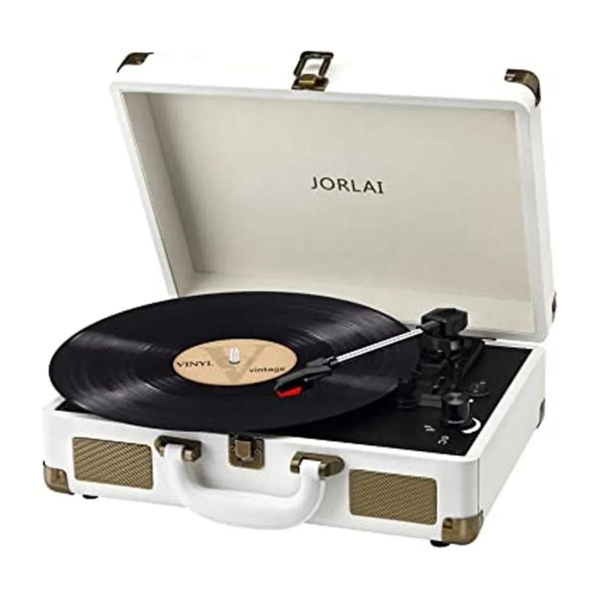 JORLAI tocadiscos de 3 velocidades con Bluetooth integrado con batería Bluetooth, altavoces estéreo, reproductor de discos vintage, maleta, protable, grabación, PC, color blanco