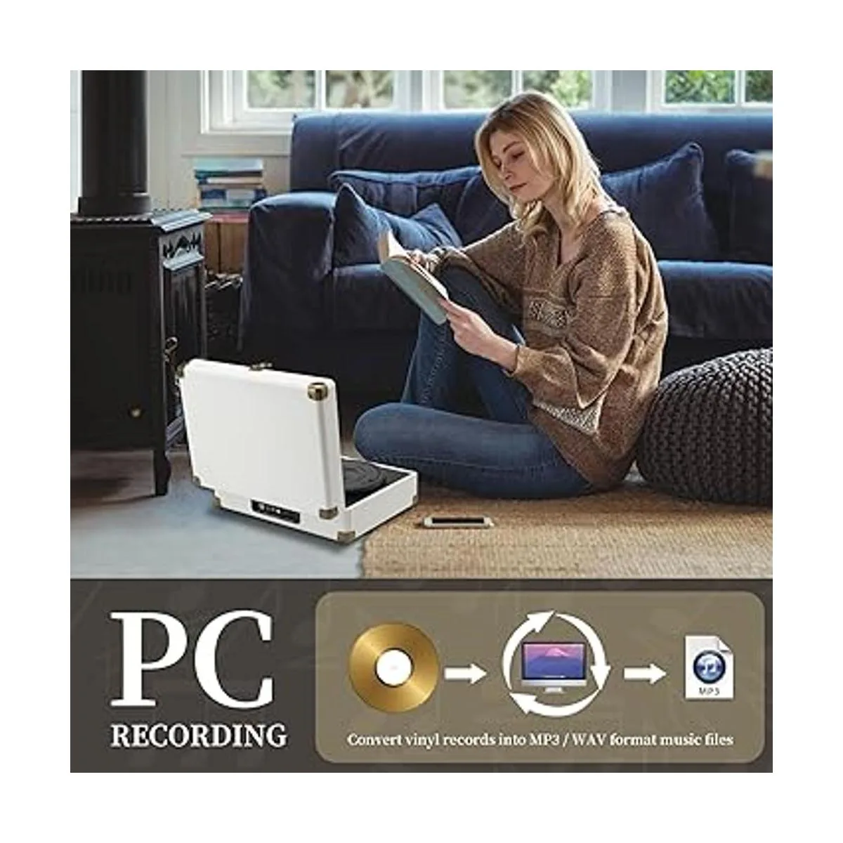 Grabación de vinilo a MP3 Reproducir discos de vinilo generalmente produce un espectro mucho más completo de sonidos, rangos y ritmos que las personas que solo han escuchado música digitalizada comprimida. Suena más completo, real y vivo. Con el software incluido también puedes grabar audio WAV/MP3 desde una grabación de vinilo para una reproducción posterior en tu computadora y dispositivos móviles.