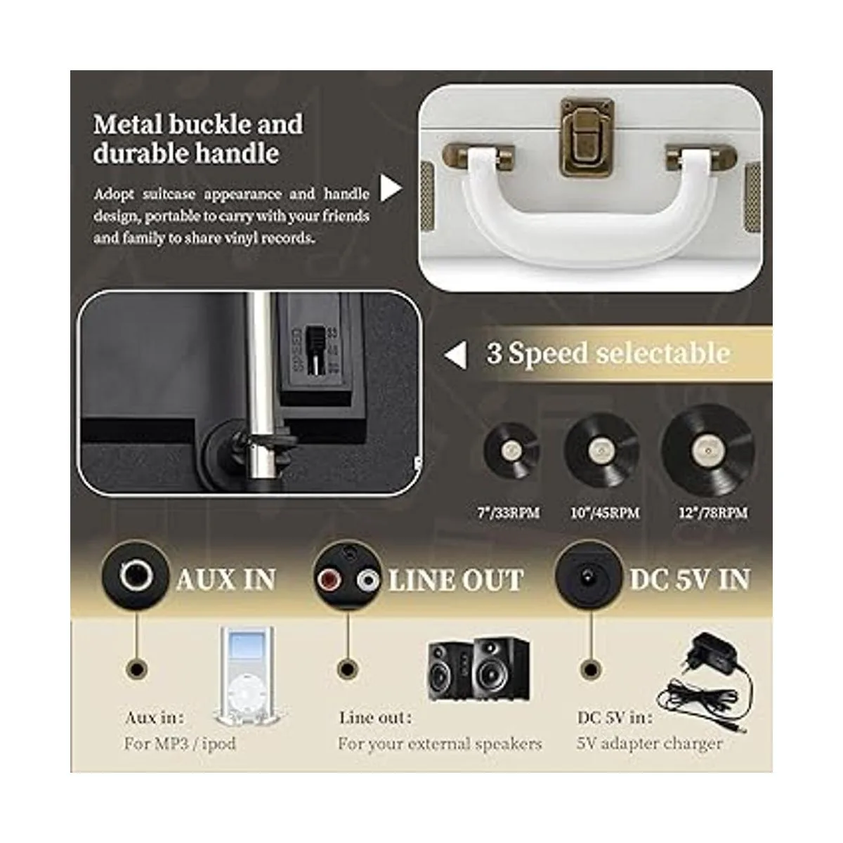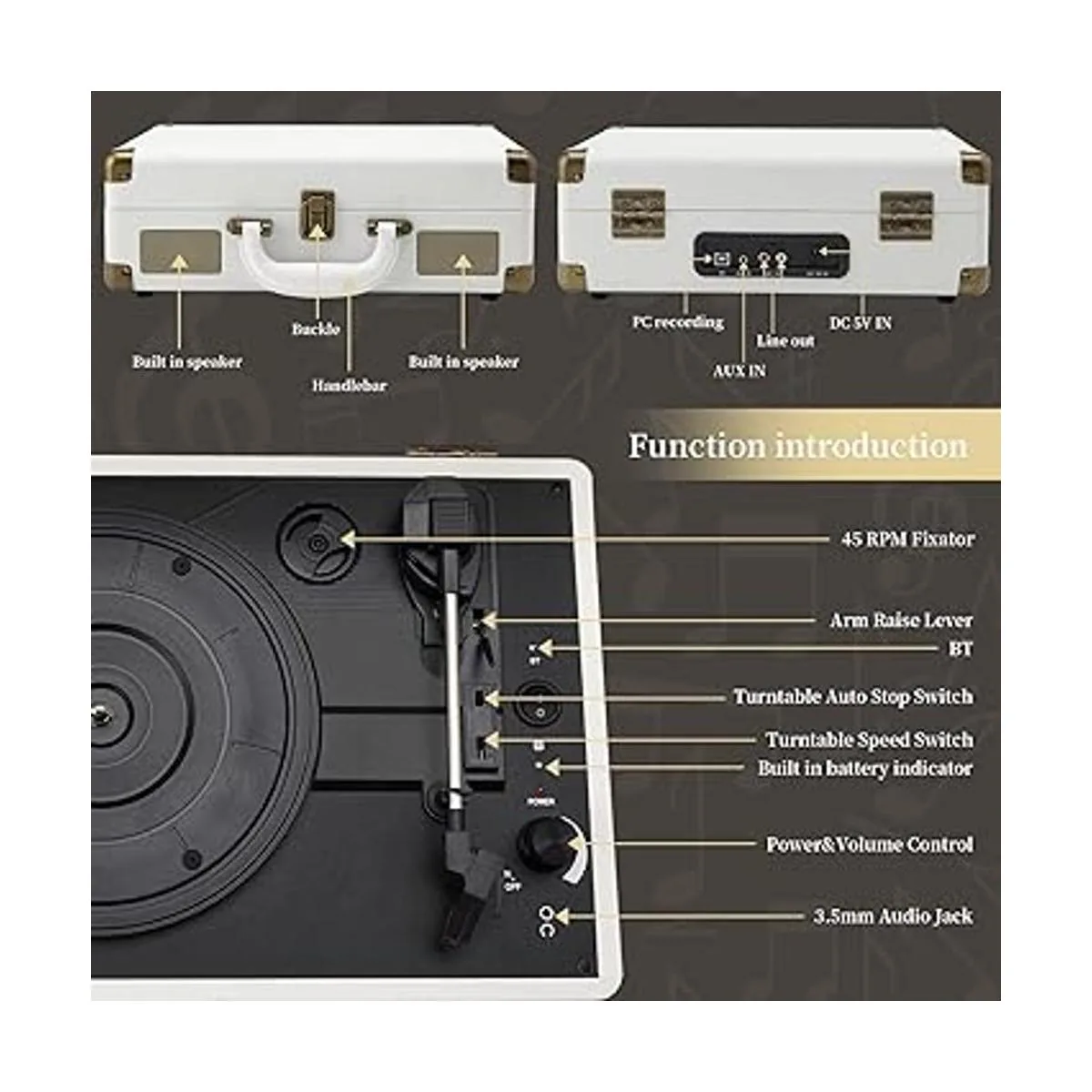 Diseño moderno y experiencia vintage Diseño blanco fresco, se adapta mejor a la decoración moderna del hogar, mientras que la experiencia de música vintage te trae infinitos recuerdos hermosos de los viejos tiempos. El diseño del maletín hace que sea fácil de mover, puedes llevarlo a cualquier lugar, disfrutar de tu vida. Ideal para Navidad, padre, madre y amigos.