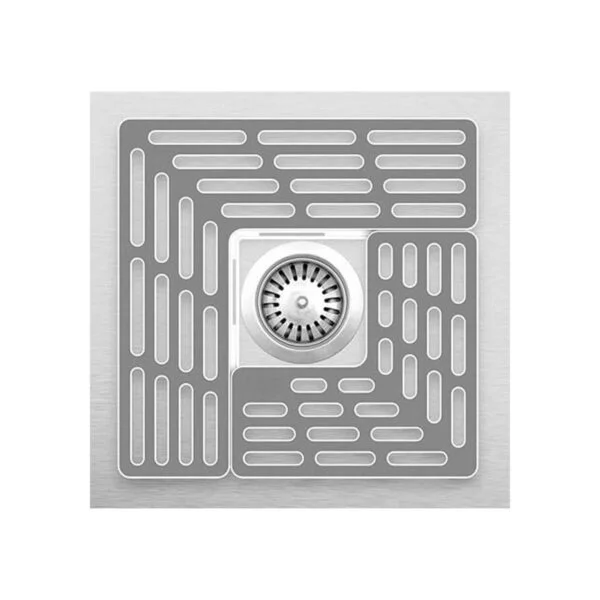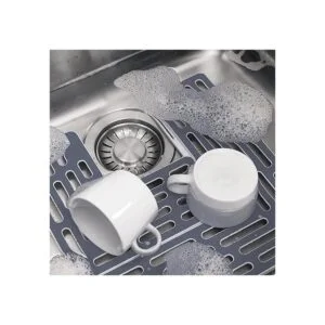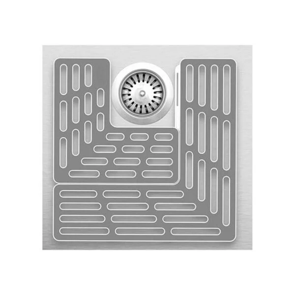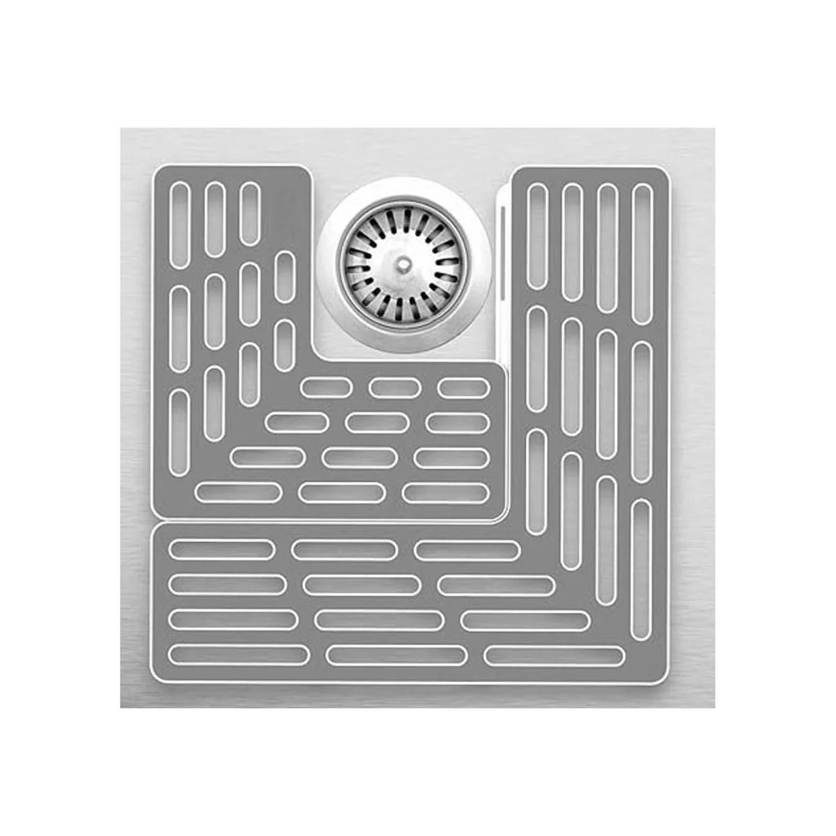 La alfombrilla de dos piezas se puede colocar en el fregadero en diferentes configuraciones para adaptarse alrededor de tu drenaje