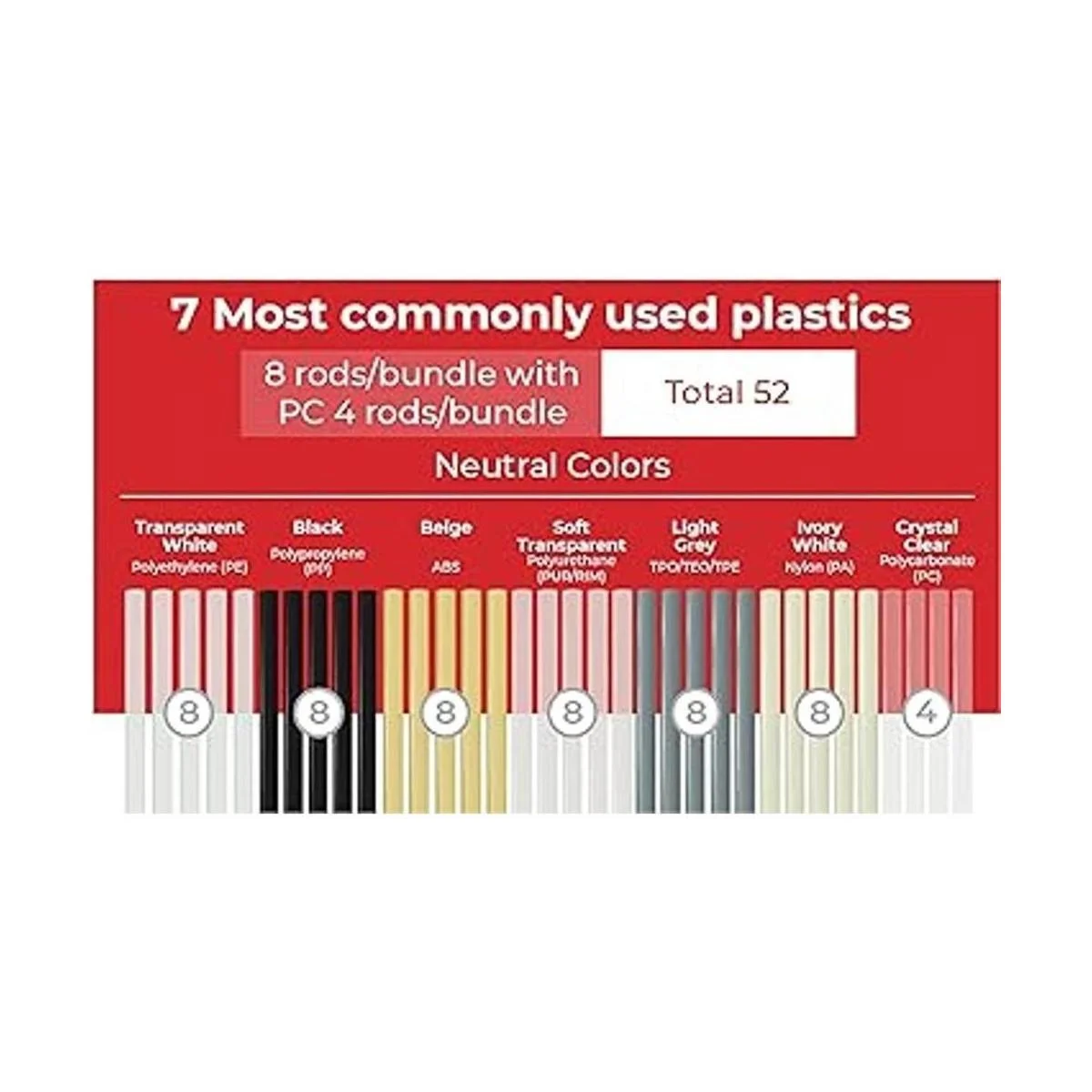 JOUNJIP Varillas de soldadura de plástico, 7 tipos de plástico de soldadura (PP PU ABS PE TPO PA PC) plásticos más comunes, para uso con kit de soldadura de plástico Jounjip, paquete de 52 unidades de 13 x 1/8 pulgadas de diámetro