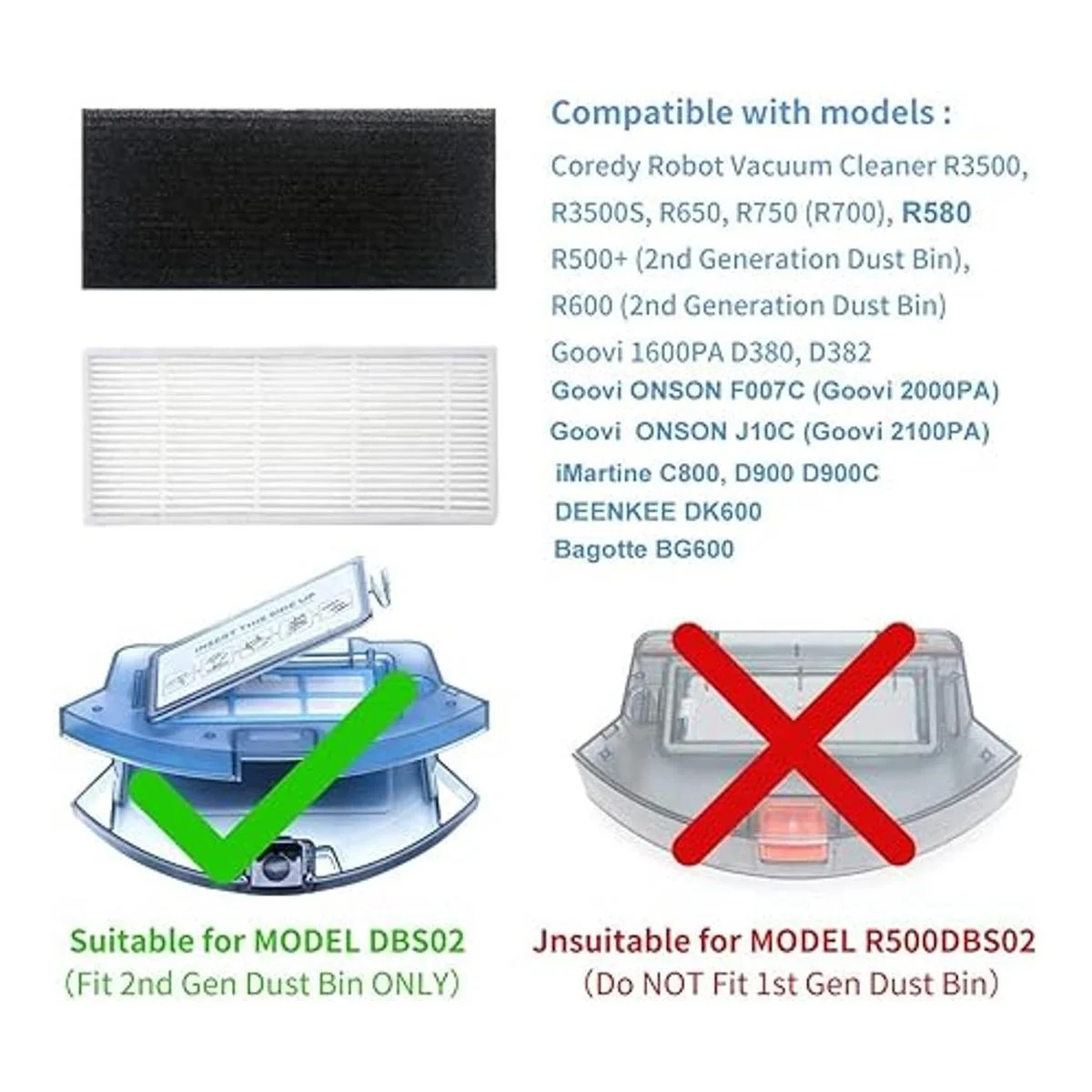 Las piezas de repuesto son compatibles con aspiradora robot Coredy R3500, R3500S, R550R500, R650, R750, R580, G800, G850, R600, D400 cubo de polvo de 2 generación, Bagotte BG600 BG700 BG80 BG80 0 Goovi D380, D382 Goovi 1600PA, Goovi de ONSON F007C Goovi 2000PA, Goovi de ONSON J10C Goovi 2100PA, iMartine C800, D900 D900C, DEENKEE DK600. Kyvol Cybovac E20 E21 E31 No es compatible con Coredy R300 y R500 1 generación.