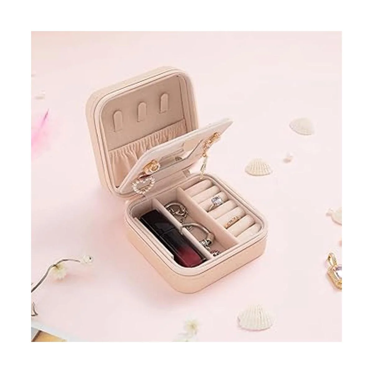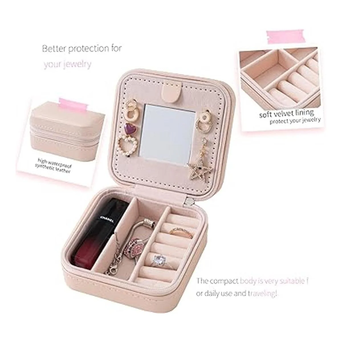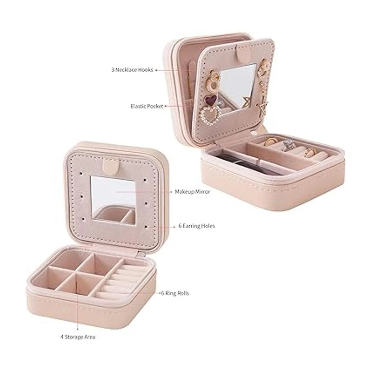Lugar todo en uno: esta caja organizadora de joyas incluye 6 rollos de anillo, 3 ganchos para collar, 1 mini espejo de tocador y 4 compartimentos divididos para proteger tus preciosas piezas.