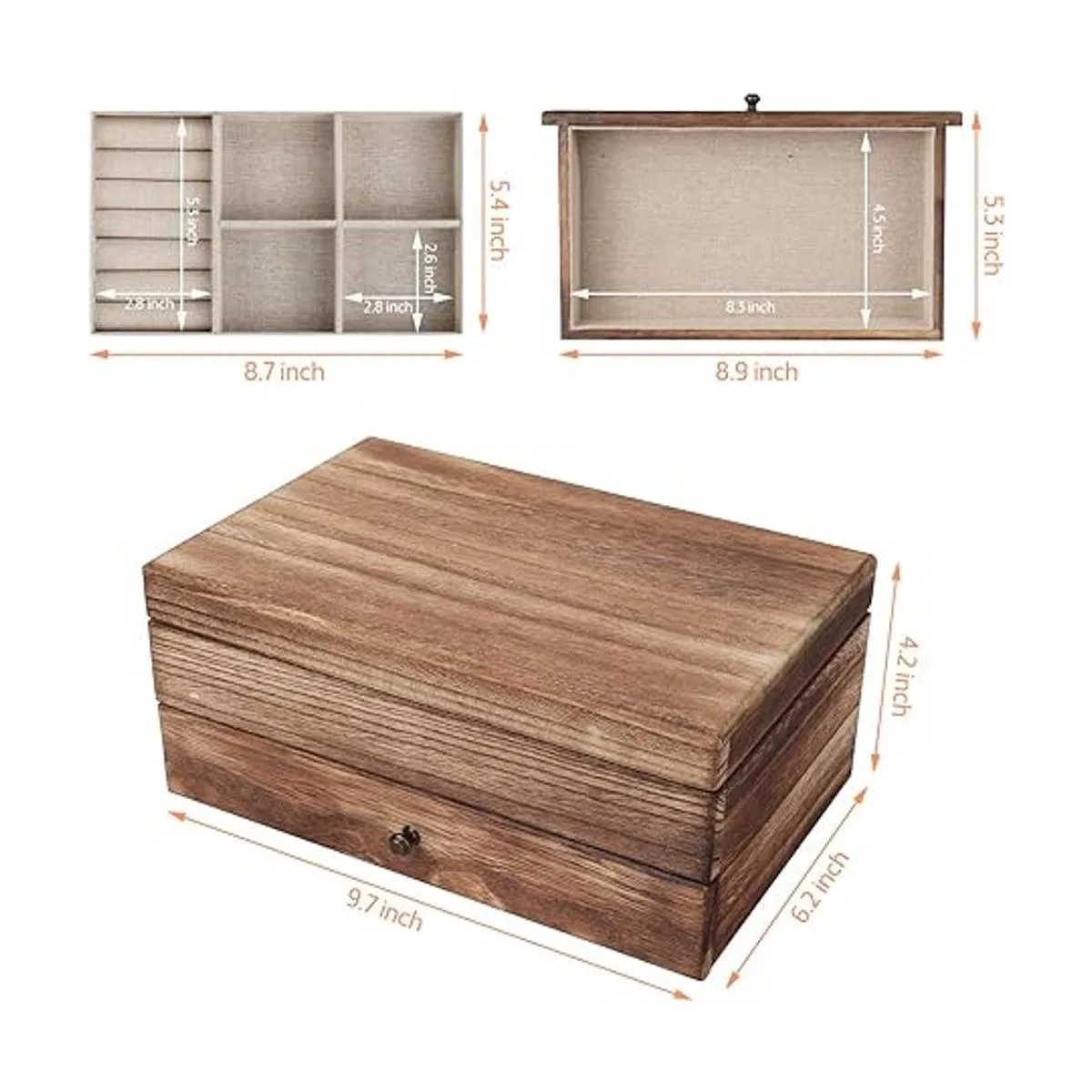 Joyero clásico: la caja organizadora de joyas está hecha de madera maciza y acabado con negro carbonizado en un estilo rústico, resistente y duradero para soportar cosméticos de joyería pesados. El interior cubierto de tela de lino mantiene tus joyas bien contra el polvo, arañazos y daños. Mango delicado de metal que resalta la belleza retro. Cualquier detalle está especialmente diseñado para organizar joyas.