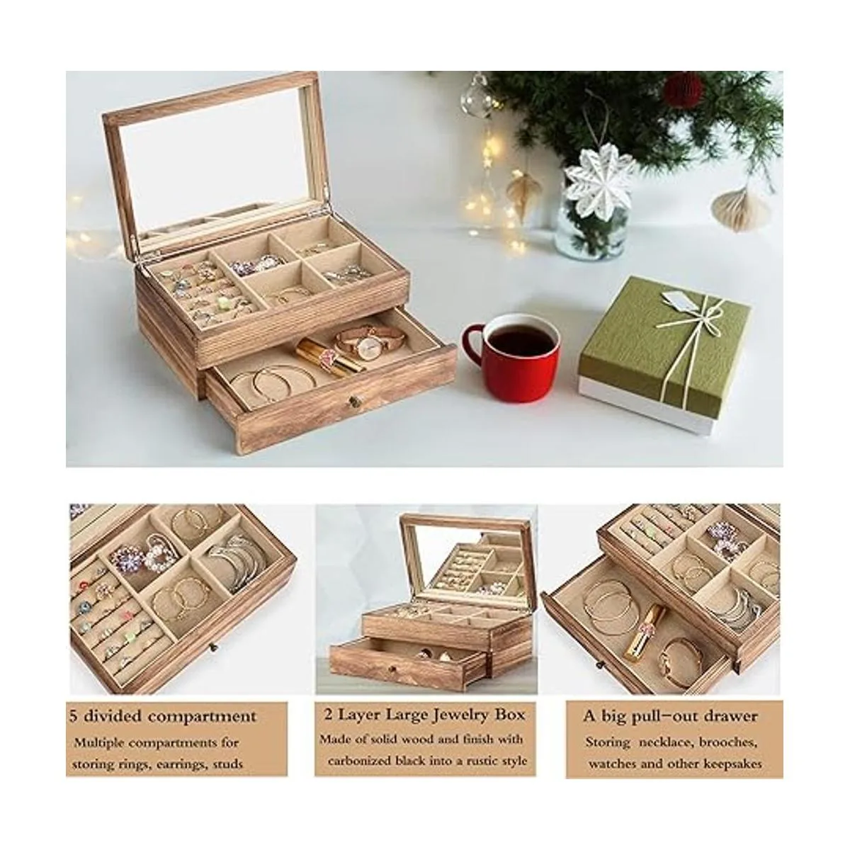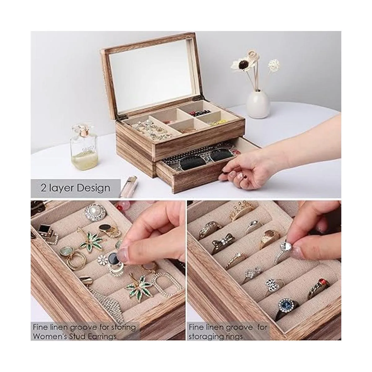 Joyero organizador para mujer, caja grande de almacenamiento de joyas de 2 capas, caja de joyería de madera rústica con espejo y bandeja de anillos para collares, aretes, pulseras, anillos, estilo vintage madera antorchada
