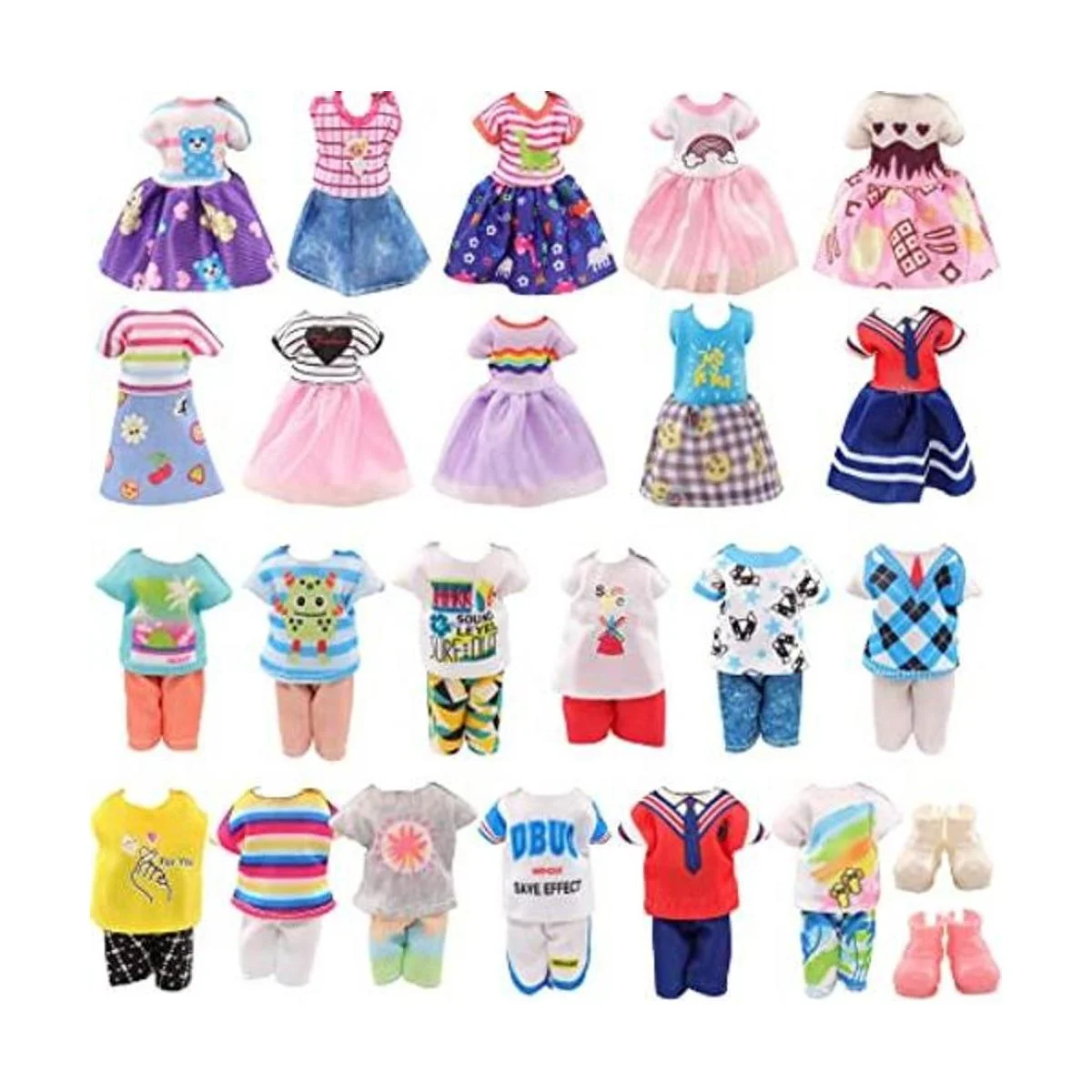 El paquete incluye: 10 piezas de ropa de muñeca 5 piezas de ropa de niño 5 piezas de ropa de niña y 2 zapatos de niña