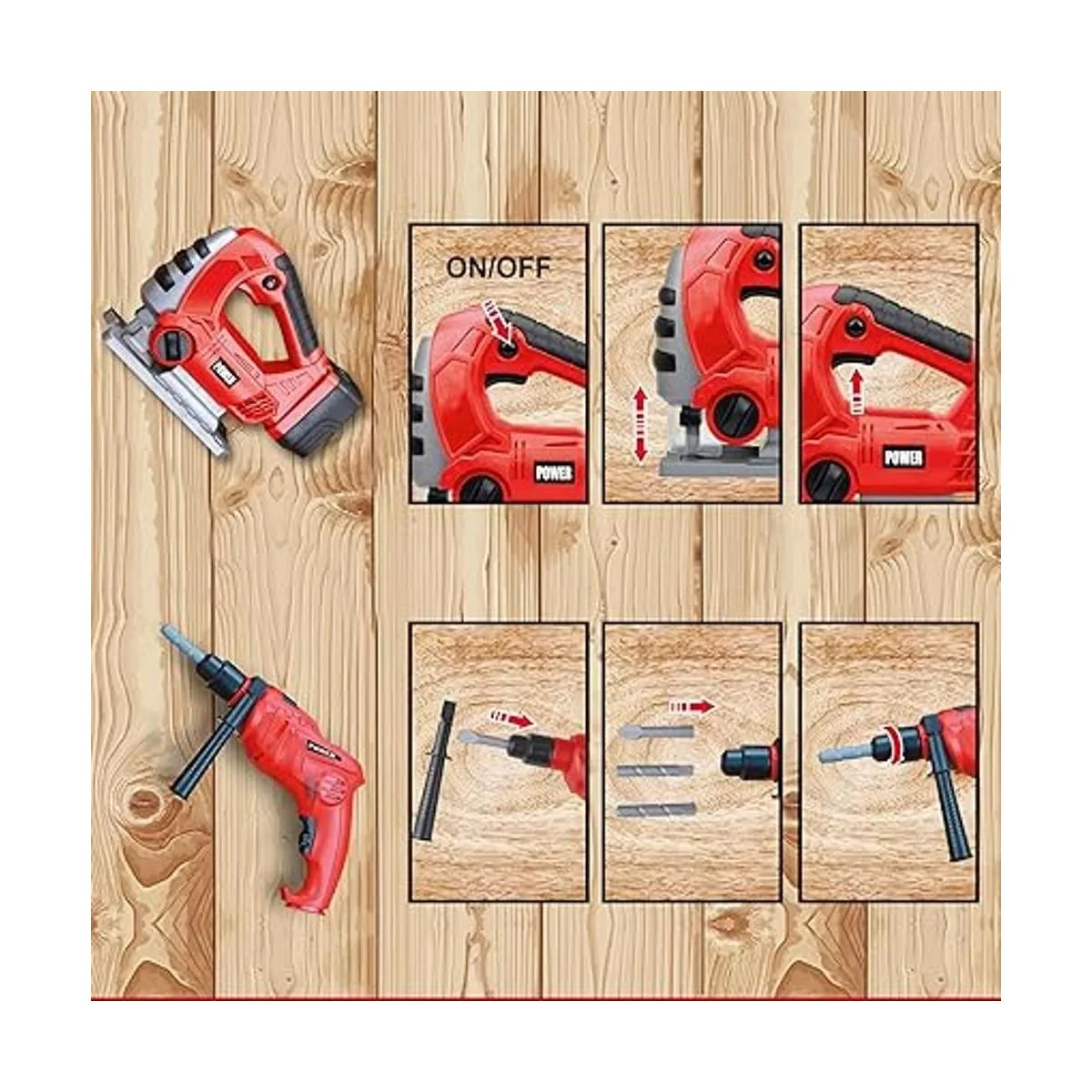 SUPER VALUE COMPREHENSIVE SET. Our Bright Red Electronic Pretend Tool Set includes Jigsaw, Flashlight, Electric Drill, and a Reciprocating Saw. This is the perfect build tool to nurture little future mechanic building builders