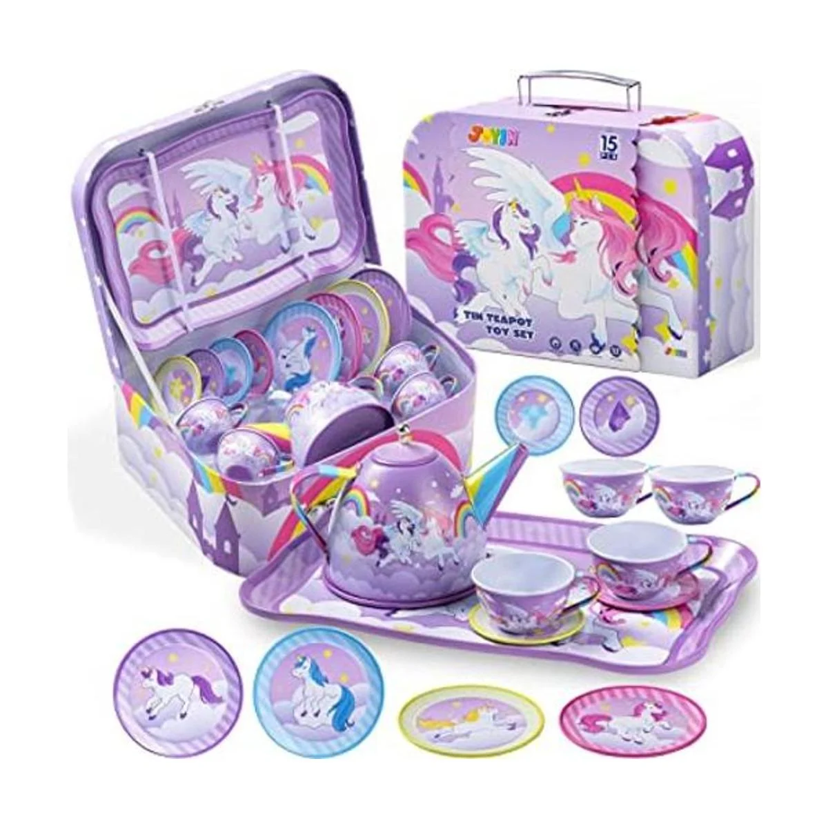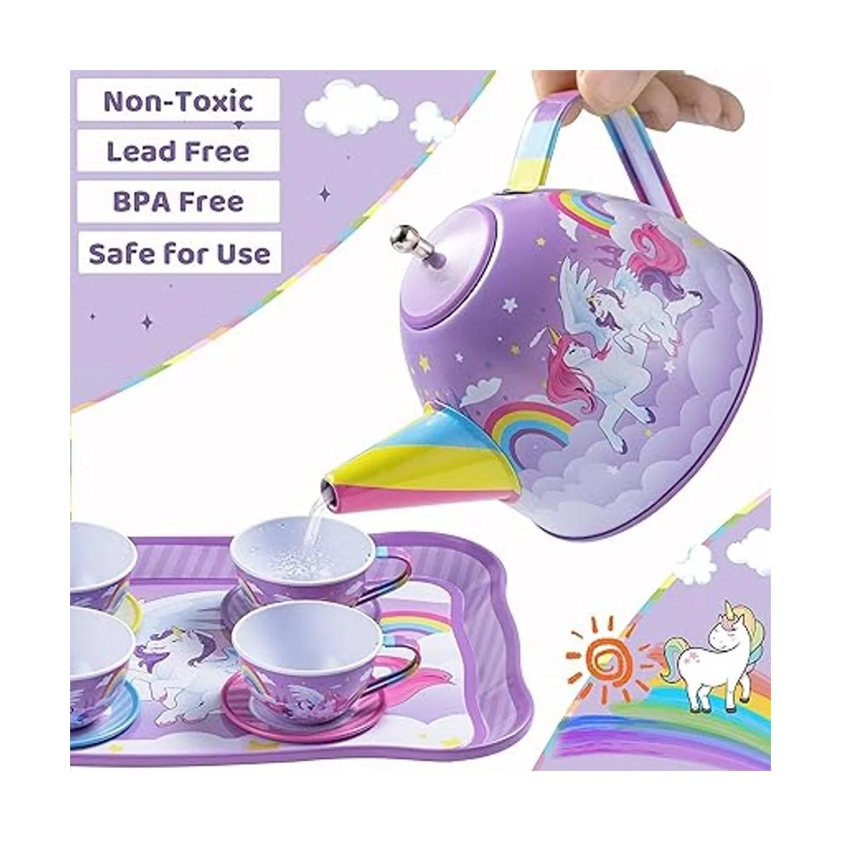 Función real. Este adorable juego de latas de juguete está diseñado para jugar a simular, animando a los niños a usar su imaginación y mejorar su creatividad y habilidades sociales. El juego de té está decorado con un unicornio mágico, arco iris y otro encantador castillo. Seguro que deleitará e inspirará a tus pequeños unicornios.