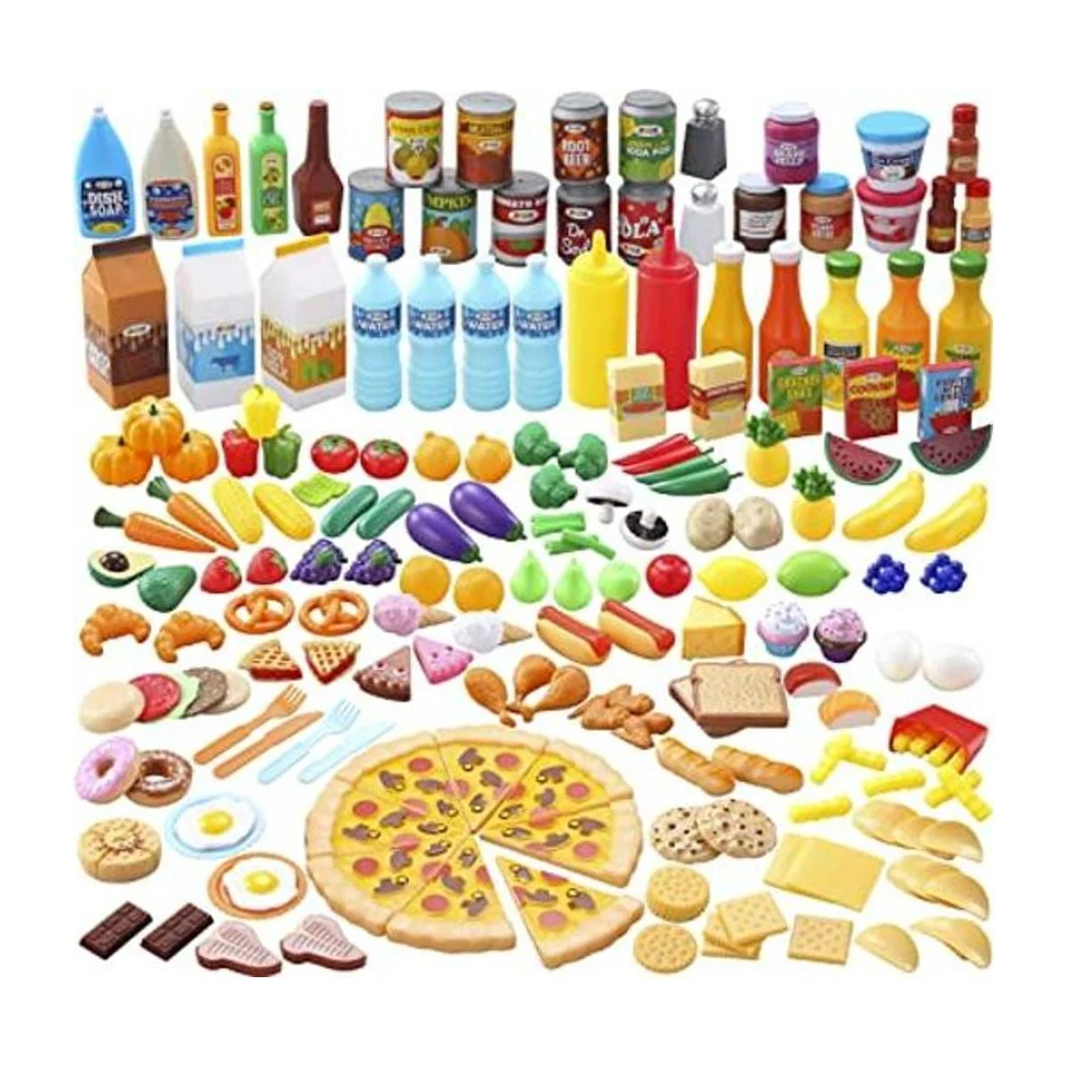 Paquete: Este set de accesorios de cocina está formado de 200 piezas de juguetes de mentiras para niños. Incluye frutas, verduras, latas de alimentos, latas de refrescos, postre, botella de salsa, botella de condimento, caldo de pollo, jabón de lavar platos y muchos más.