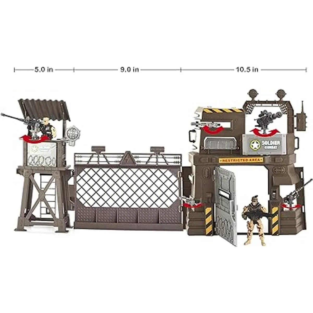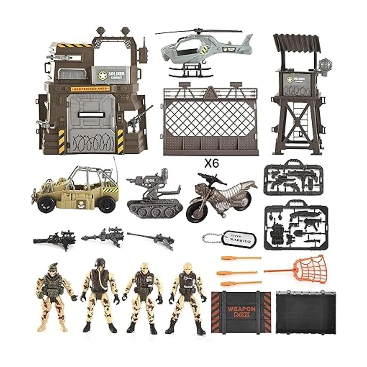 Juego completo de gran valor. Nuestro juego completo de juguetes de base militar incluye 1 puerta, 1 torre de vigilancia y puertas realistas, 1 helicóptero, 1 camión de combate, 1 juguete de torreta de tanque móvil, 1 motocicleta, 4 figuras de acción de soldados de juguete, misiles y red en 1 caja de armas, varias armas y equipos, 1 etiqueta de nombre.
