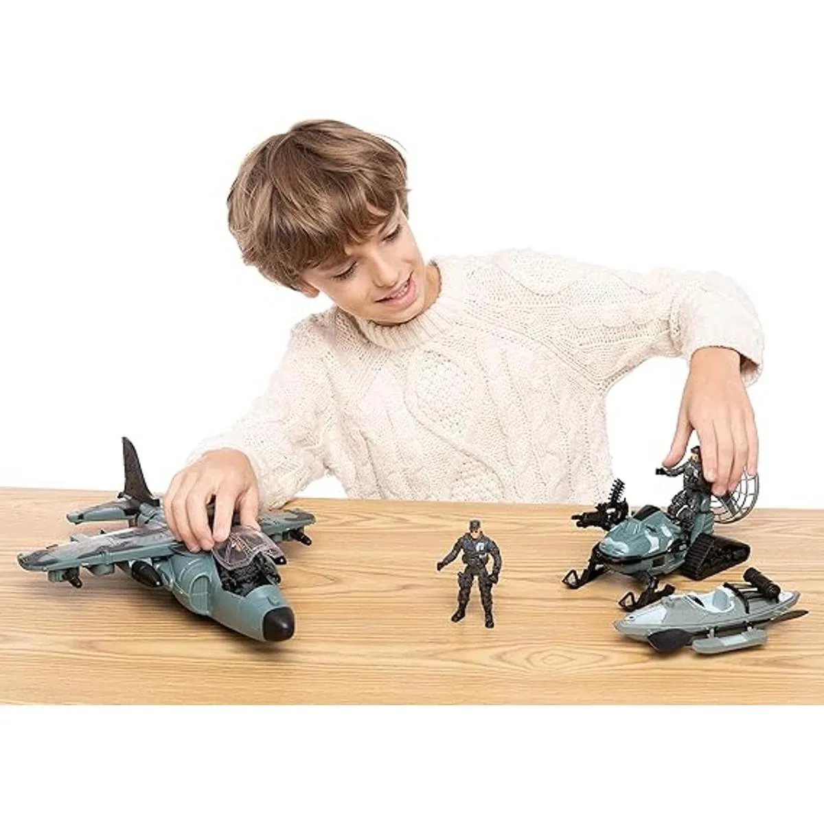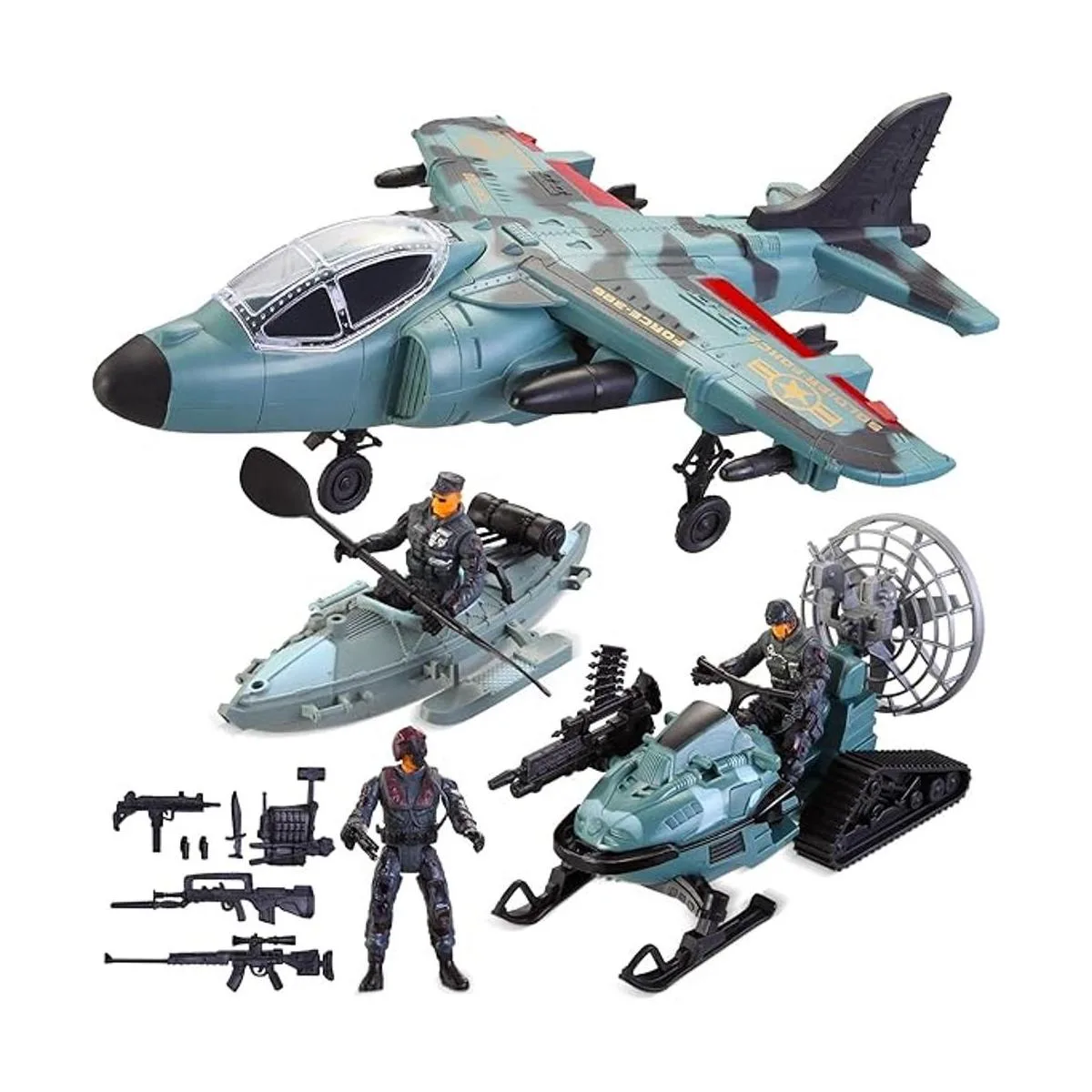 Juego completo. Nuestro juguete militar pretend Play Snow Camouflage Land and Air incluye 1 avión de combate realista gigante, 1 bote kayak, 1 moto de nieve, 3 figuras de acción de soldados del ejército y varios accesorios de equipo con 1 caja de armas. El tamaño del avión de combate es de 16 x 12 pulgadas.