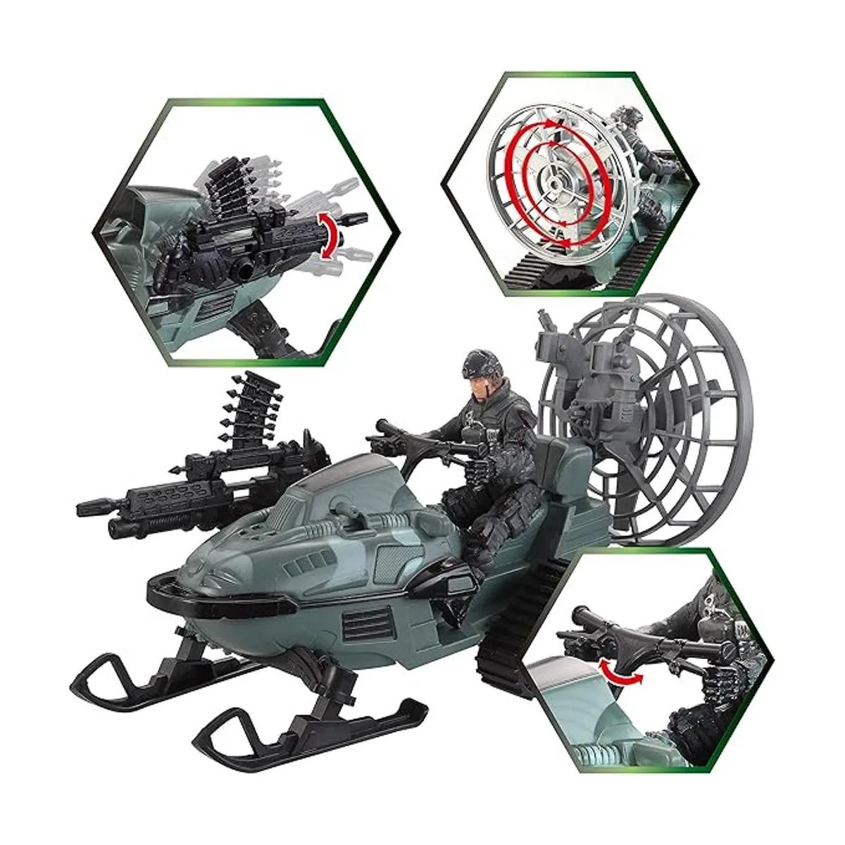 Función real. Nuestro avión de combate tiene características realistas. Los soldados pueden sentarse en la cabina del avión de combate, y los misiles de ambos lados son desmontables. Hay ruedas de tren de aterrizaje en la parte inferior del combatiente, que se pueden utilizar para fijar el avión. El mango y la ametralladora en la moto de nieve son móviles, y el ventilador en la cola también se puede girar. Las figuras de hombre tienen articulaciones móviles que pueden hacer varias posturas y sostener el equipo.