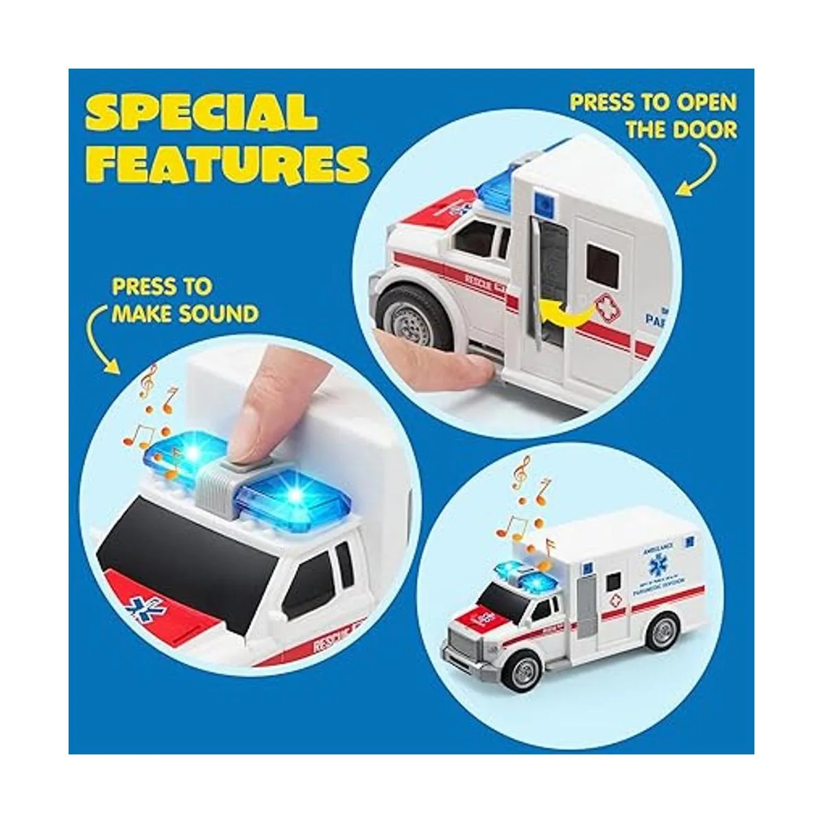 Incluye 1 ambulancia, 1 camión de bomberos, 1 helicóptero de rescate y 1 coche de policía diversión sin fin. Una buena variedad de 4 héroes de la ciudad de uso diario. Todos ellos tienen luz y sonido.