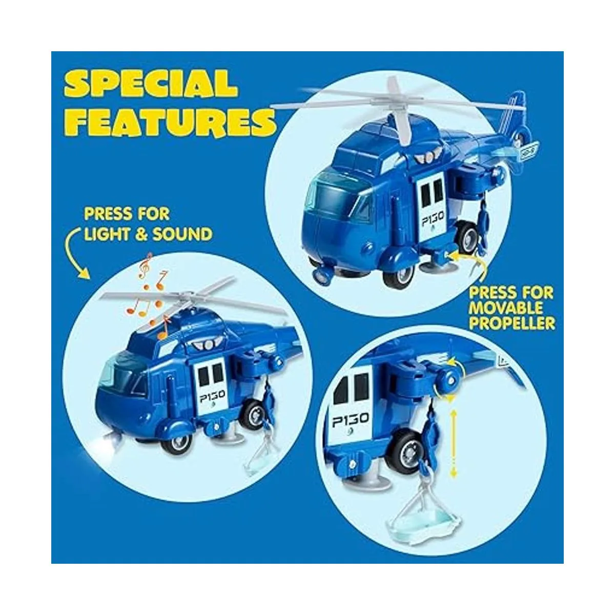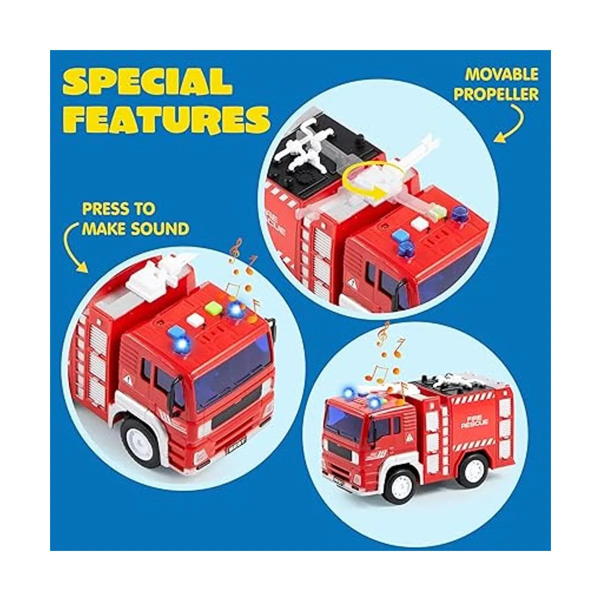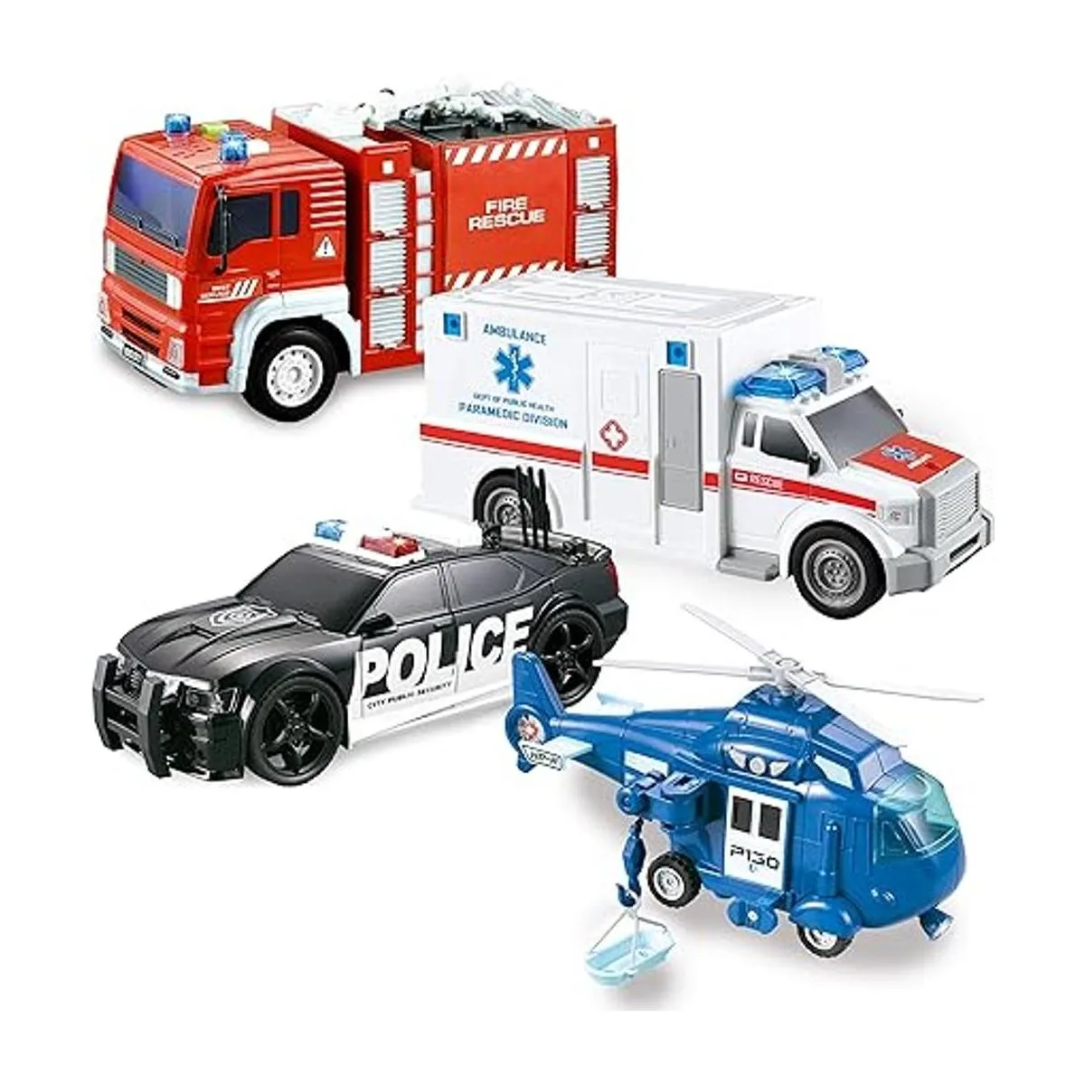 JOYIN Paquete de 4 juguetes de emergencia para vehículos, vehículos de fricción con luz y sonido, incluyendo camión de bomberos, juguete de ambulancia, auto de policía y helicóptero de juguete, el mejor regalo para niños pequeños
