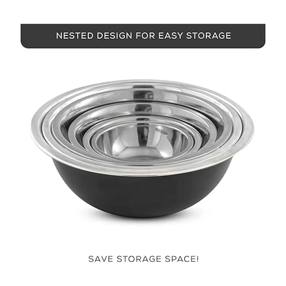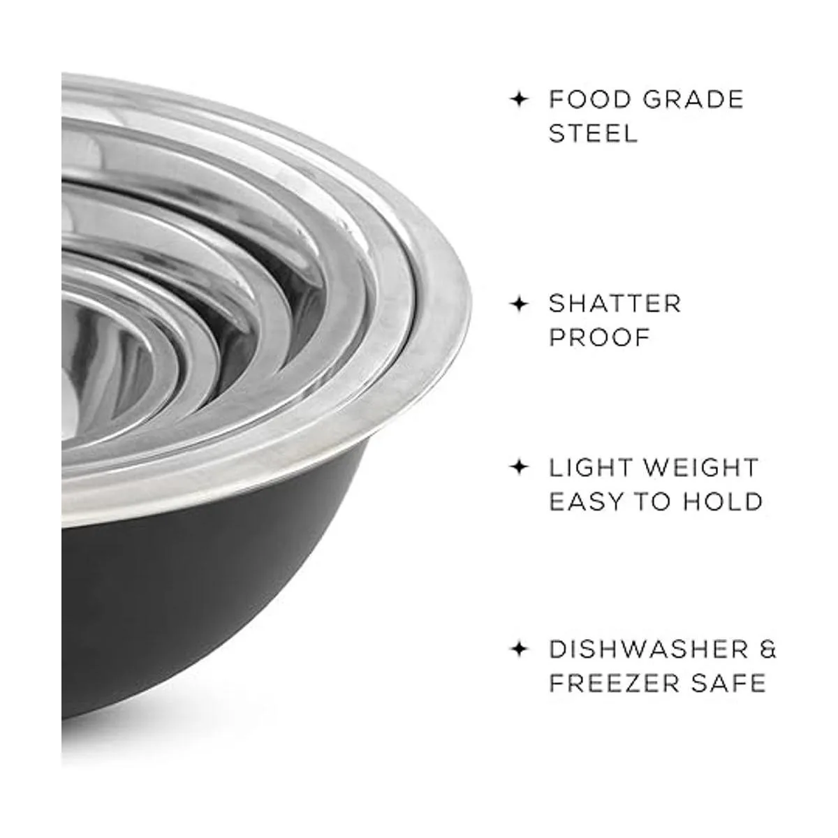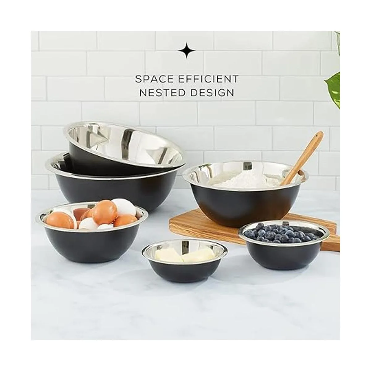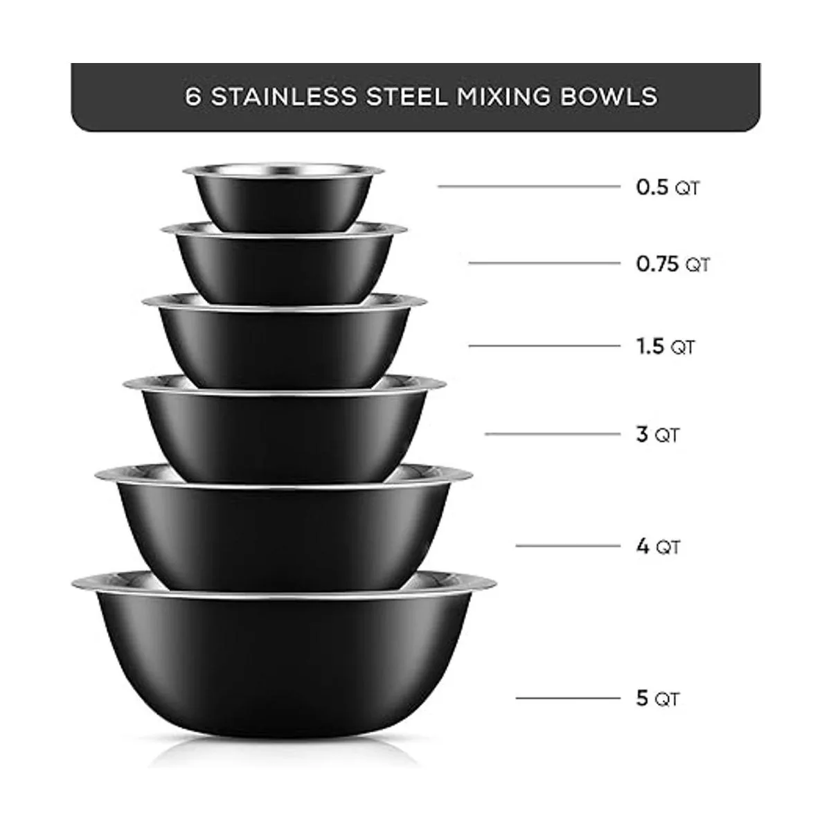 JoyJolt Juego de 6 tazones para mezclar de acero inoxidable negro. Tazón grande de 5 cuartos a cuenco de metal pequeño de 0.5 cuartos de galón. Tazones de anidación para cocina, cocina y almacenamiento. Cuencos para masa, masa y hornear
