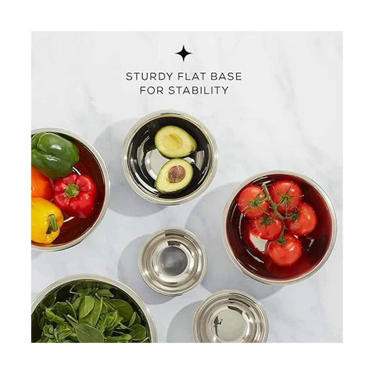 Por qué los chefs utilizan un juego de cuencos de acero inoxidable como este Ligero, hasta el cuenco de metal grande, este juego de cuencos de mezcla de acero inoxidable es fácil de mover, duradero contra astillas, produce picos voluminosos de ensueño al hacer merengues o mousse, y con una base plana que es estable y bien equilibrada.