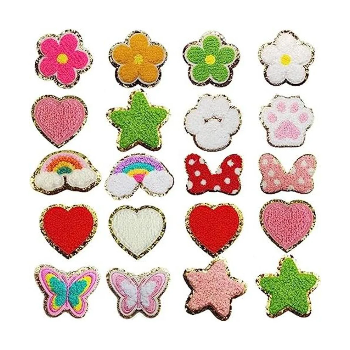 Dentro del paquete: 20 parches coloridos de chenilla para ropa en forma de corazón, estrella, pajarita, pata de perro, flor, cara sonriente, arco iris