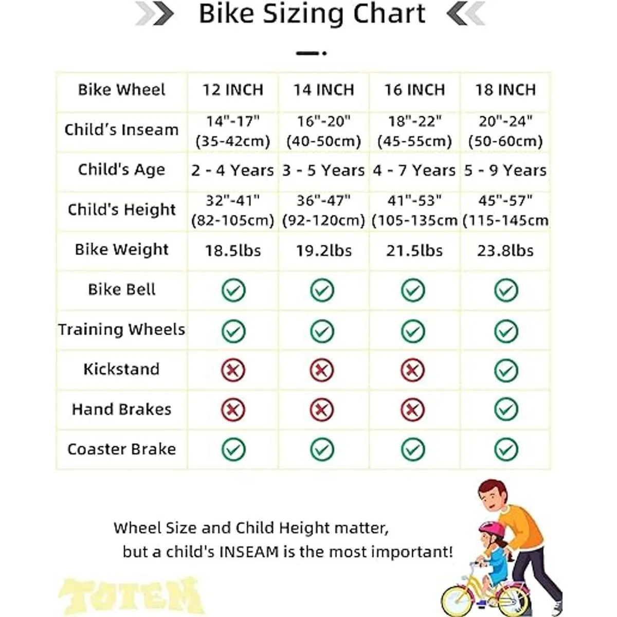 Tabla de tamaños recomendados: bicicleta de 12 pulgadas para niños de 2 a 4 años 3341 pulgadas, 14 pulgadas para 3 a 5 años 3547 pulgadas, bicicleta de 16 pulgadas para 4 a 7 años 4153 pulgadas, bicicleta de 18 pulgadas para 5 a 9 años 4359 pulgadas. Nota: la altura de los niños suele variar incluso en la misma edad, por favor, tenlo en cuenta.