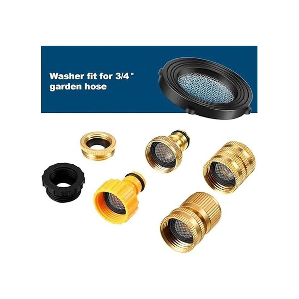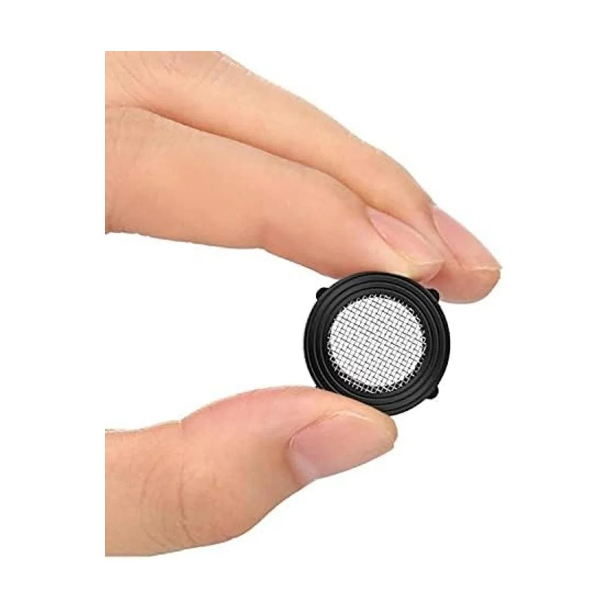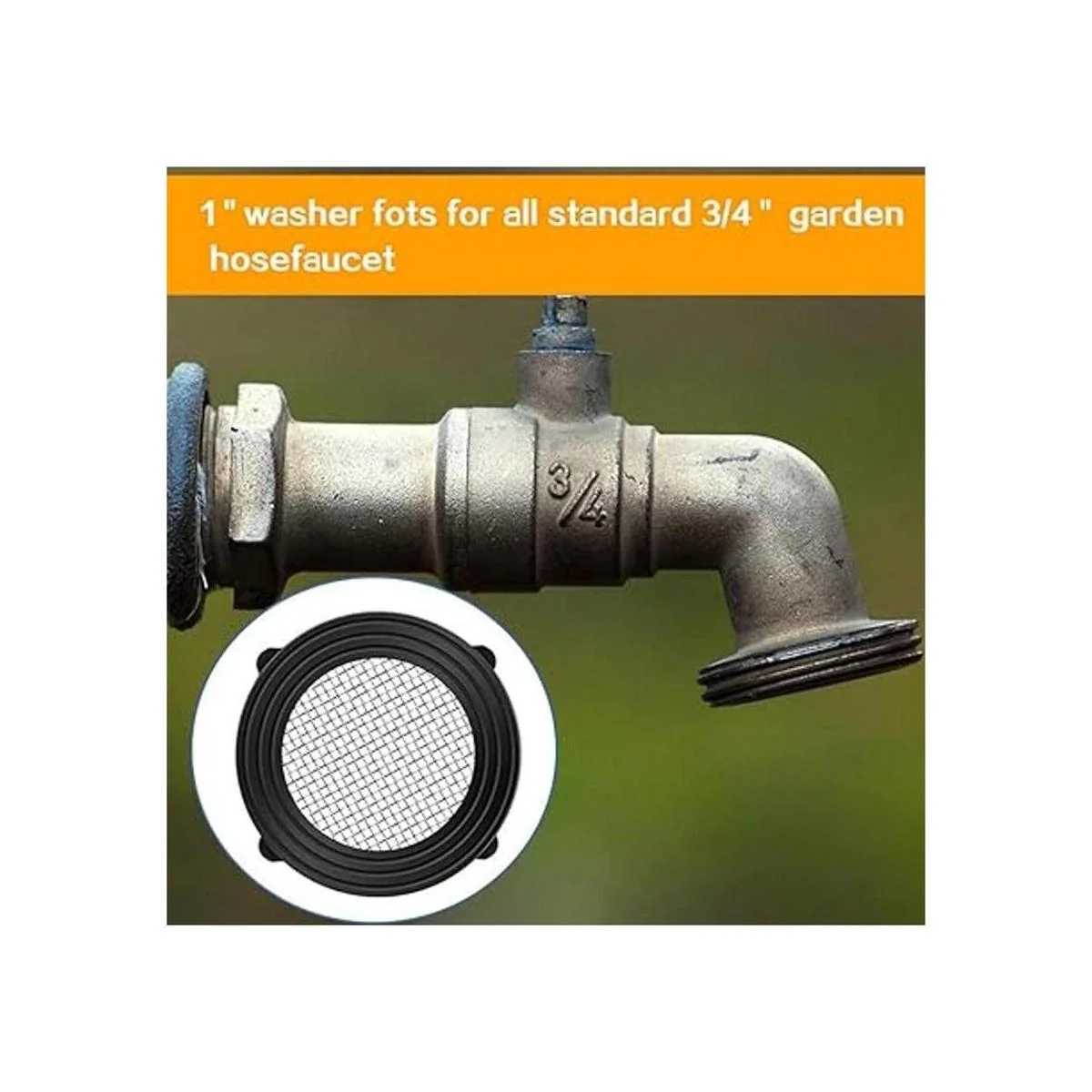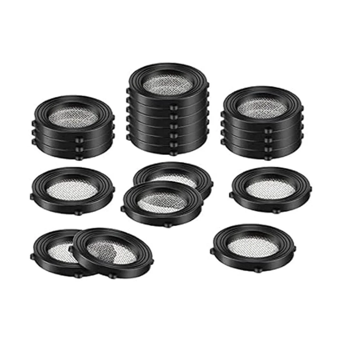 Pantalla de filtro con pestañas de autobloqueo: estas arandelas de goma están diseñadas con 40 filtros de malla de acero inoxidable y 4 pequeñas pestañas exteriores. Para filtrar arena y grava para reducir la posibilidad de obstrucción de la boquilla y fijarlas firmemente y correctamente, evitando que las arandelas se caigan de los accesorios de la manguera.