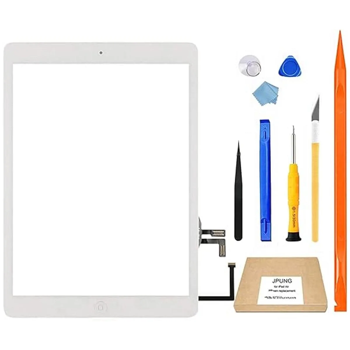 JPUNG Digitalizador de vidrio táctil de repuesto para iPad Air de 1 generación, solo para A1474 A1475 A1476 Air de 1 generación, con botón para el hogar, kit de reparación completo guía de video