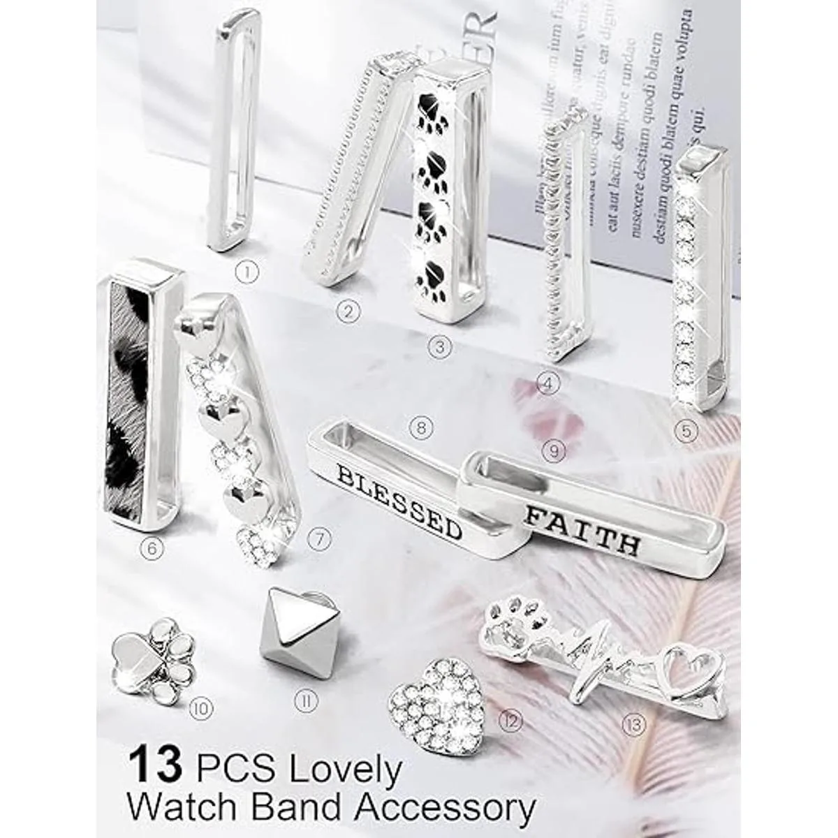 JR.DM 13 dijes plateados para Apple Watch con 10 bucles decorativos y 3 cierres clásicos, compatibles con reloj inteligente de 1.496 in, 1.575 in, 1.614 in, 1.654 in, 1.732 in, 1.772 in, accesorios para iWatch Series 8, 7, 6, 5, 4, 3, 2, 1 sin correa de reloj