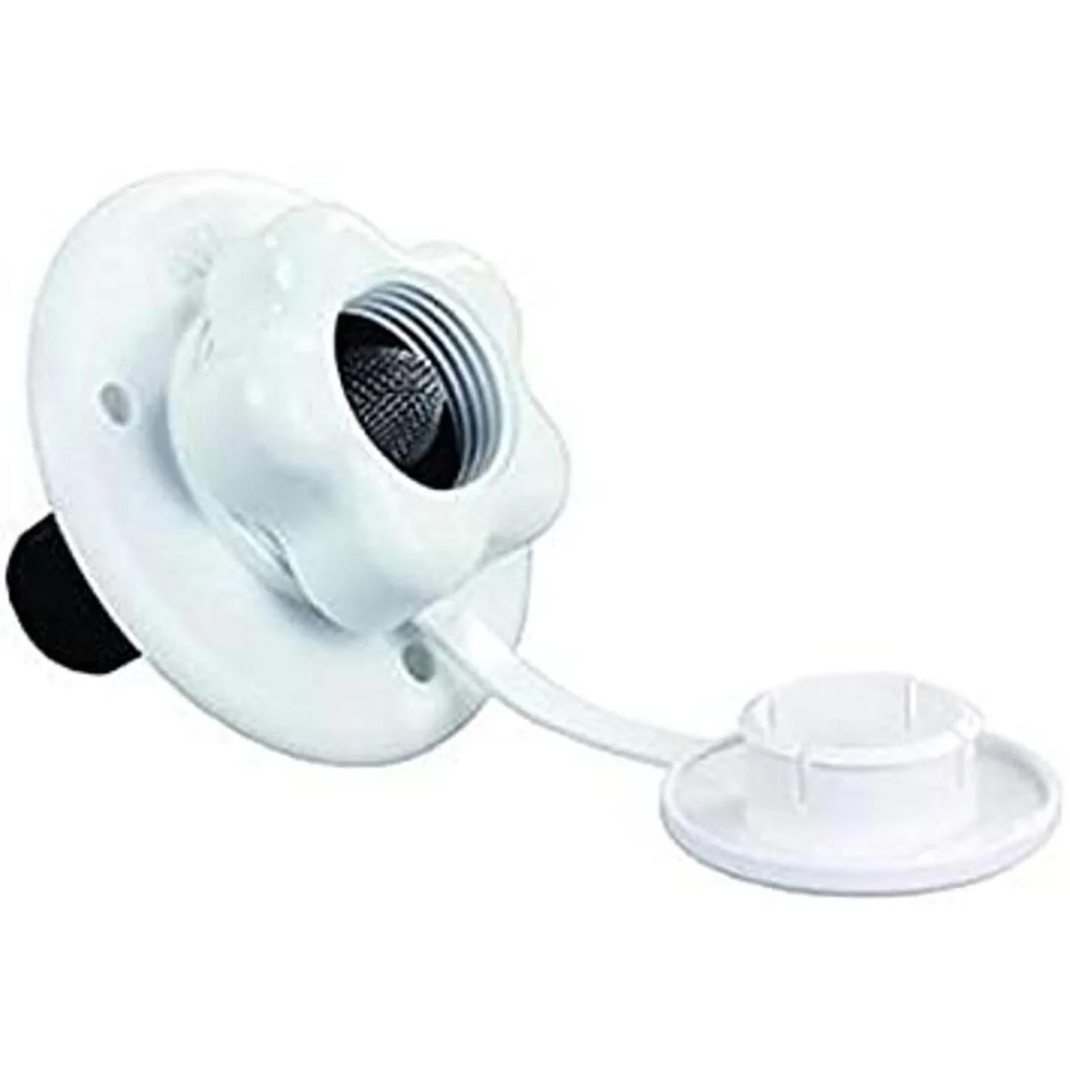Entrada de agua dulce; reemplazo directo OEM; utilizado para sistema de agua dulce de cámper ; tipo de brida; tamaño de recorte de 1.5 in de diámetro; diámetro exterior de 3.0 in x profundidad de la válvula; válvula de retención de plástico con rosca de tubo macho de 0.5 in MPT; blanco polar; individual