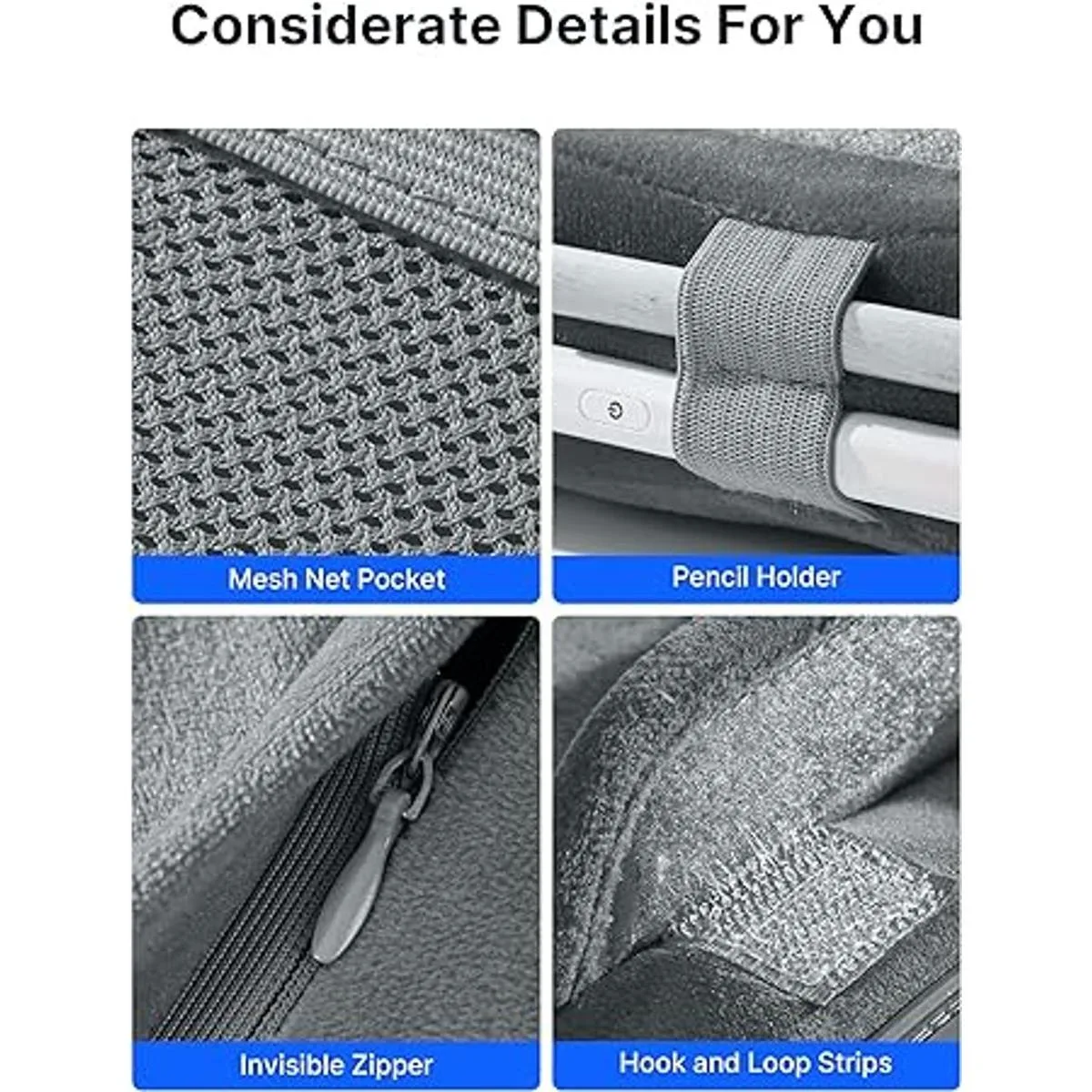 Detalles considerados: la base de soporte para tablet JSAUX proporciona un diseño de detalles más considerados. El bolsillo de red de malla se puede utilizar para poner el cable de carga y el cargador. El soporte para lápices para la fijación de tu lápiz. Funda suave extraíble y lavable con cremallera invisible inferior.