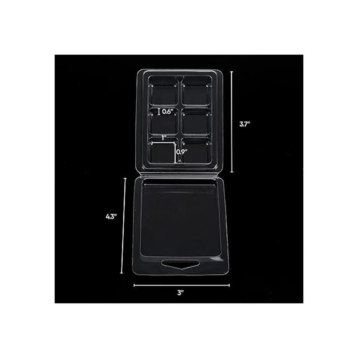El paquete incluye 100 recipientes de cera de plástico transparente. Cada molde de concha mide 4.3 x 3 x 1 pulgadas, con un total de 6 cavidades cuadradas, el cubo es de 1 x 0.9 x 1 pulgadas, con capacidad para 0.6 onzas, total 2.4 onzas.