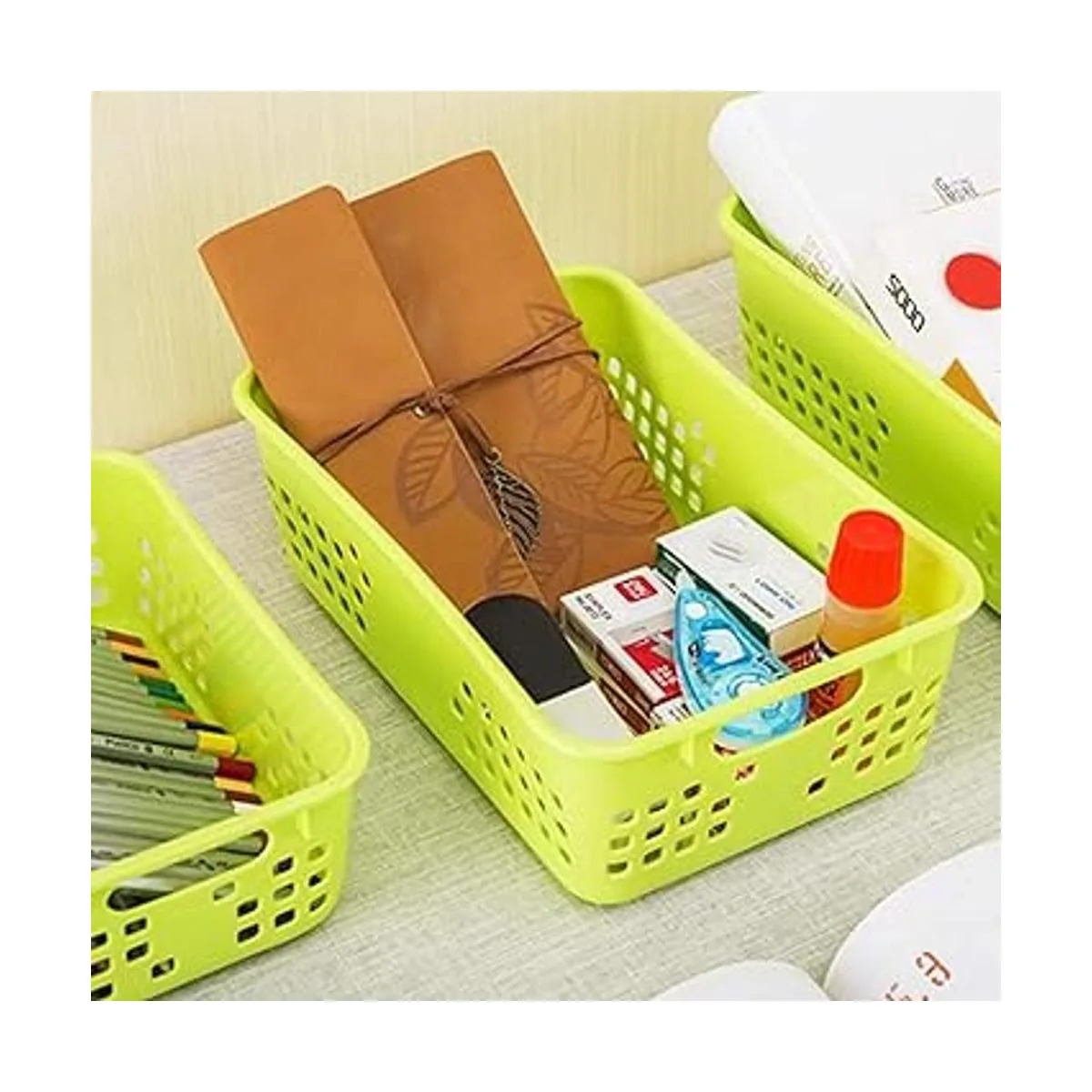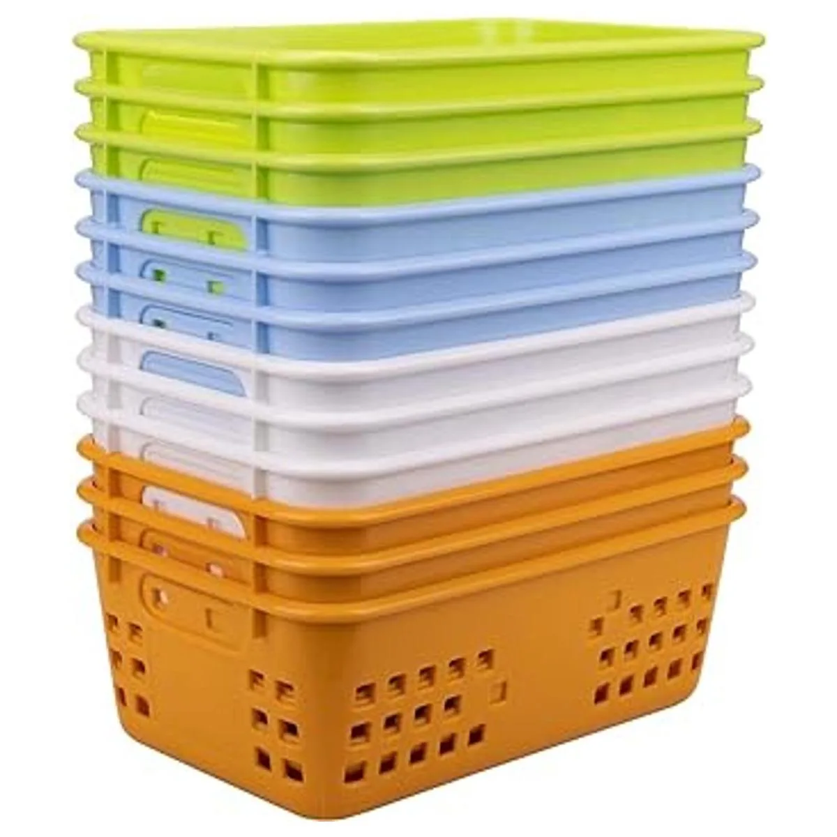 Jucoan Paquete de 12 cestas pequeñas de almacenamiento de plástico, 8.5 x 5.5 x 3 pulgadas, bandeja organizadora de plástico colorida para el aula, apilable con asas de agarre para baño, cajones, estantes, armario, oficina