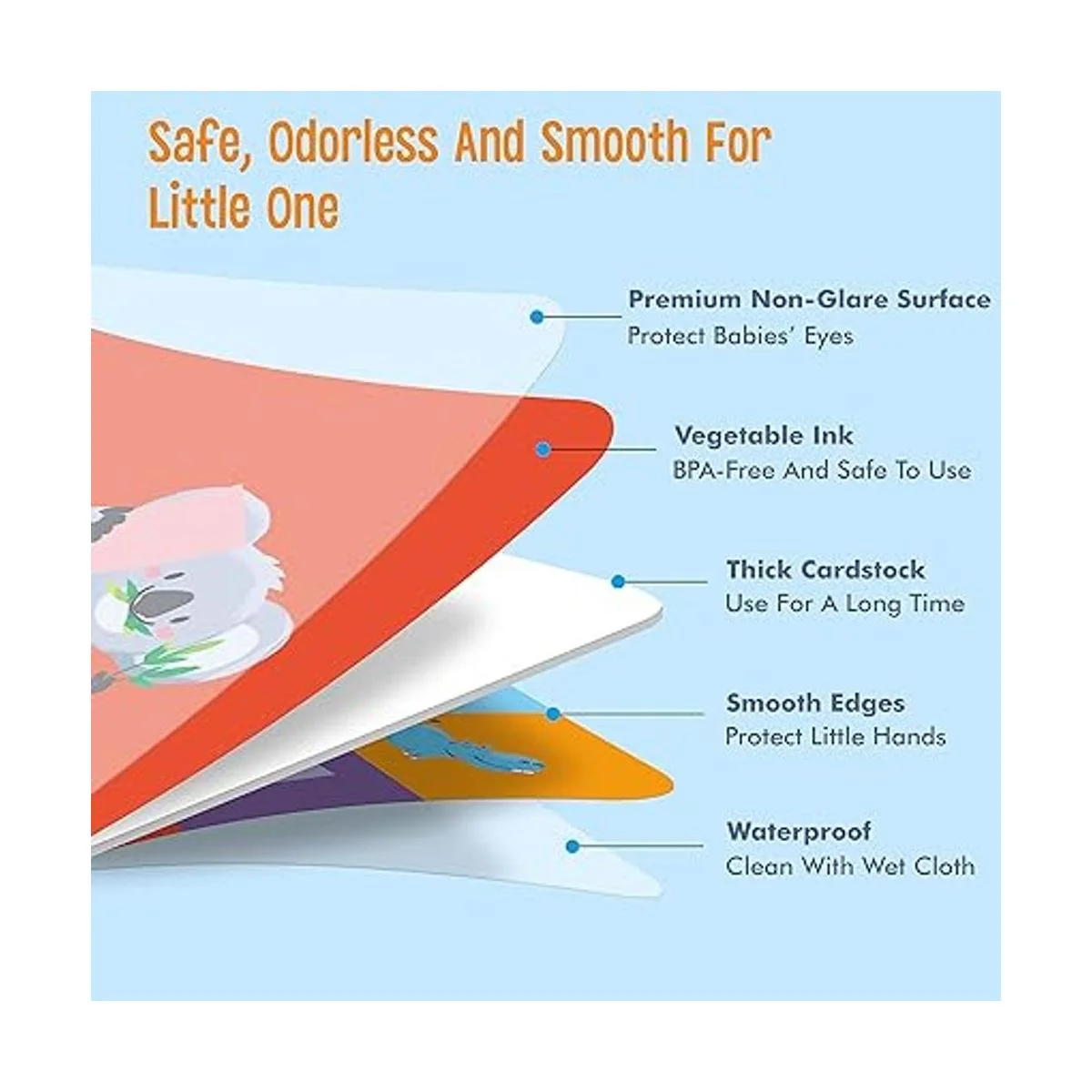 Adopta material de alta calidad: cartón grueso impreso con tinta vegetal no tóxica y laminado con tecnología a prueba de arañazos, no libera sustancias nocivas. Superficie antideslumbrante para proteger los ojos de los niños y los bordes lisos son adecuados para las manos pequeñas de los niños. Todas estas son garantías seguras para jugar.