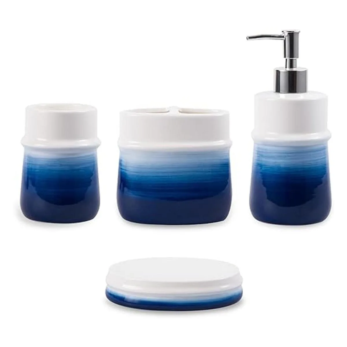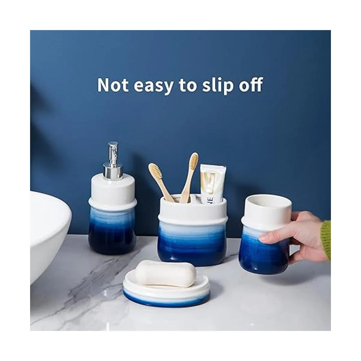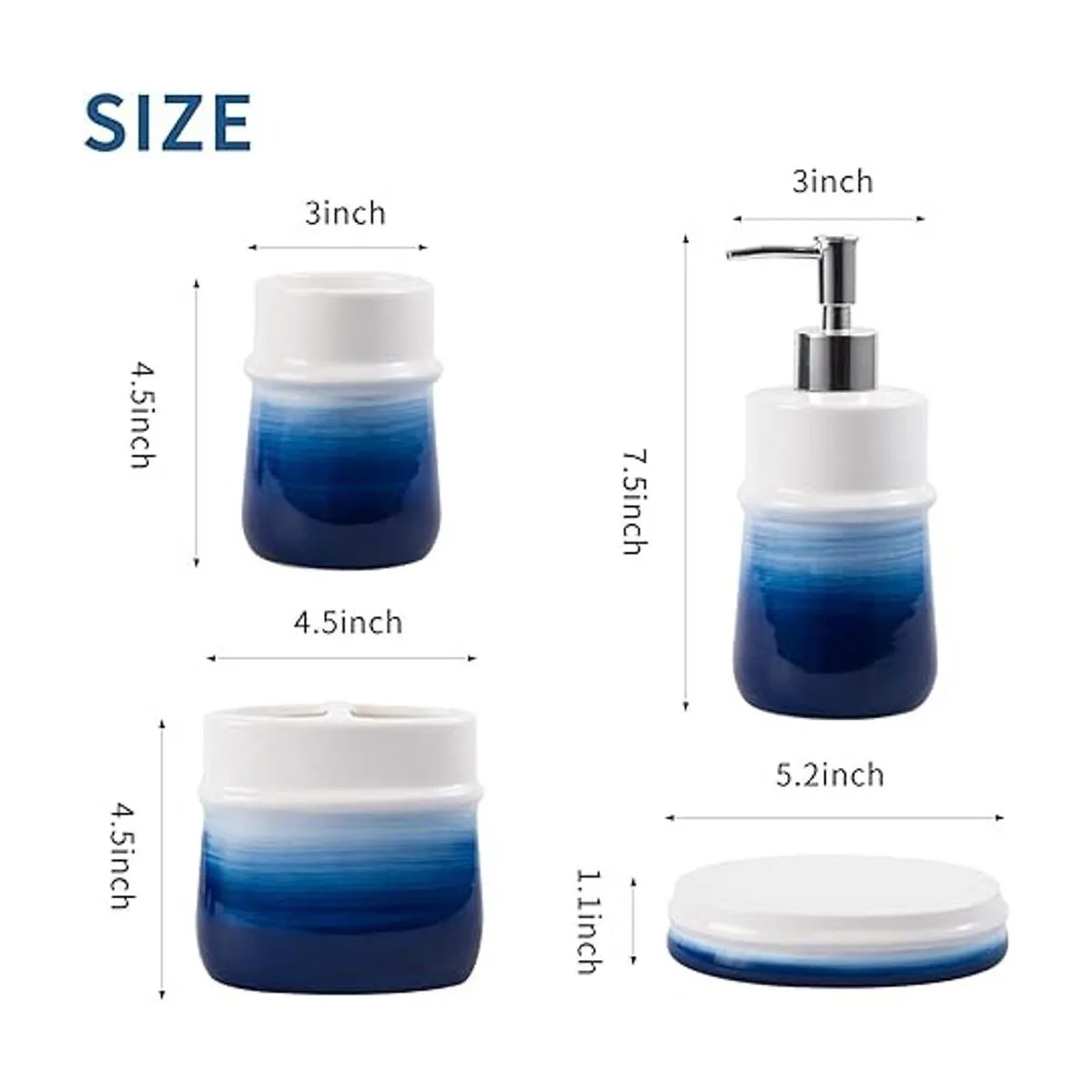 Juego completo de baño de 4 piezas: equipado con 1 dispensador de loción, 1 taza de cepillo de dientes, 1 vaso y 1 jabonera. Ten todo en el mismo color y diseño, limpia el espacio. Haz que el baño esté más organizado.