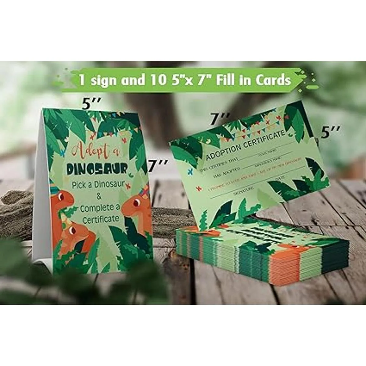 Juego de 1 letrero de dinosaurio Adopt y certificado de adopción de 10 dinosaurios, fiesta de adopción, fiesta de cumpleaños para niños, fiesta de aula021B